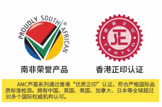 AMC获得南非荣誉产品称号及香港正印标识,代表符合30余+国家质量标准。