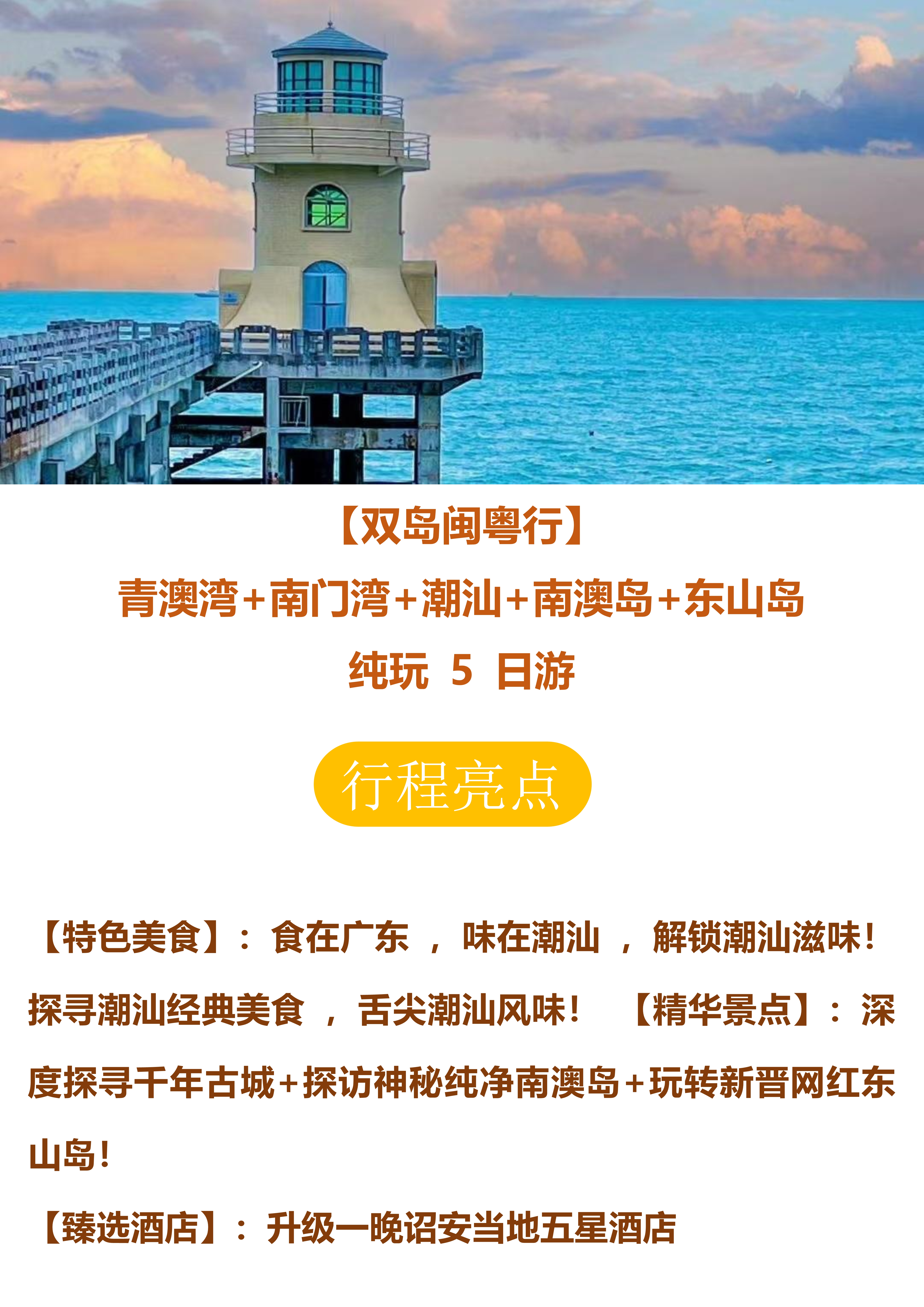 【双岛闽粤行】青澳湾+南门湾+潮汕+南澳岛+东山岛 纯玩 5 日游