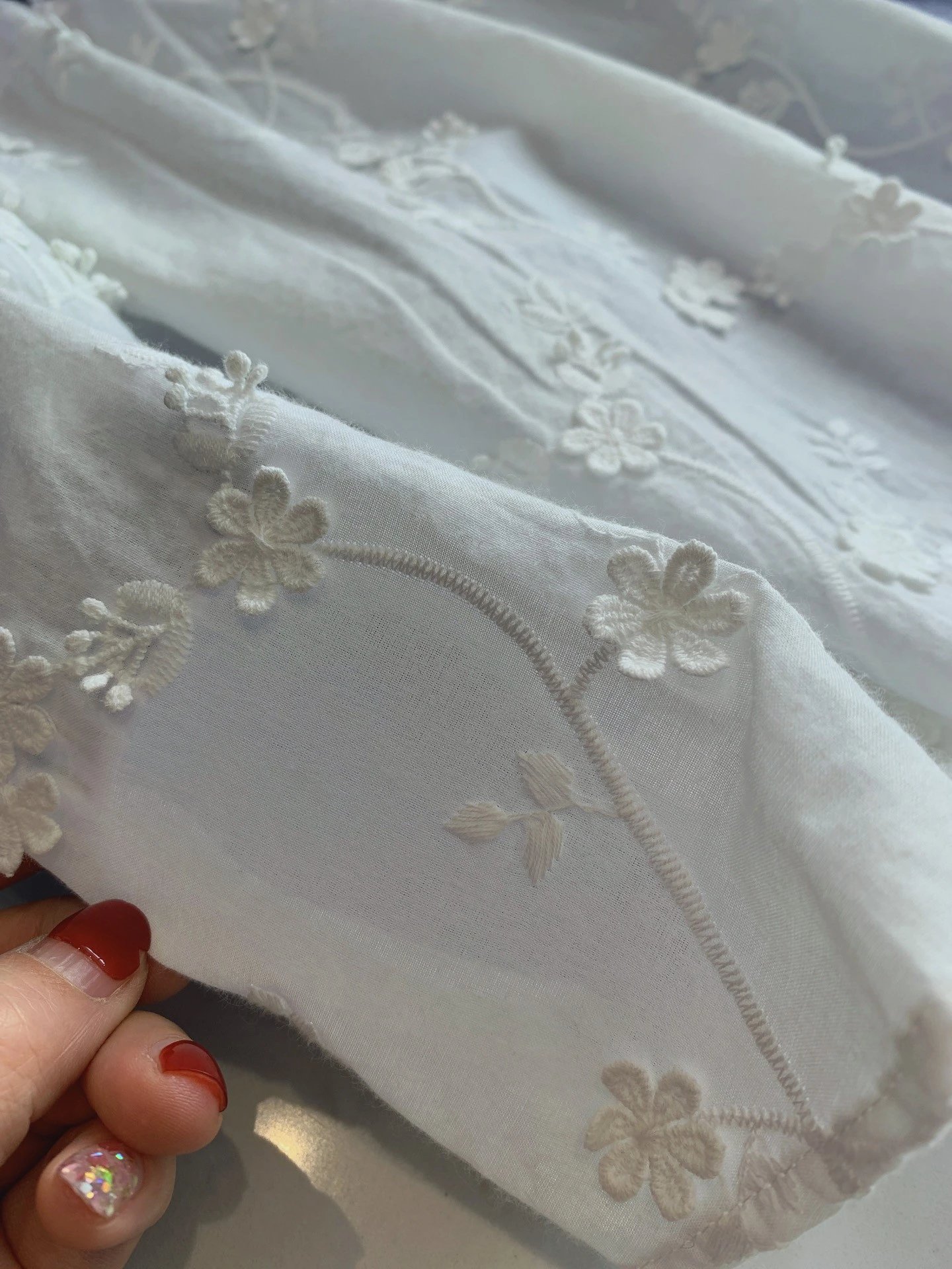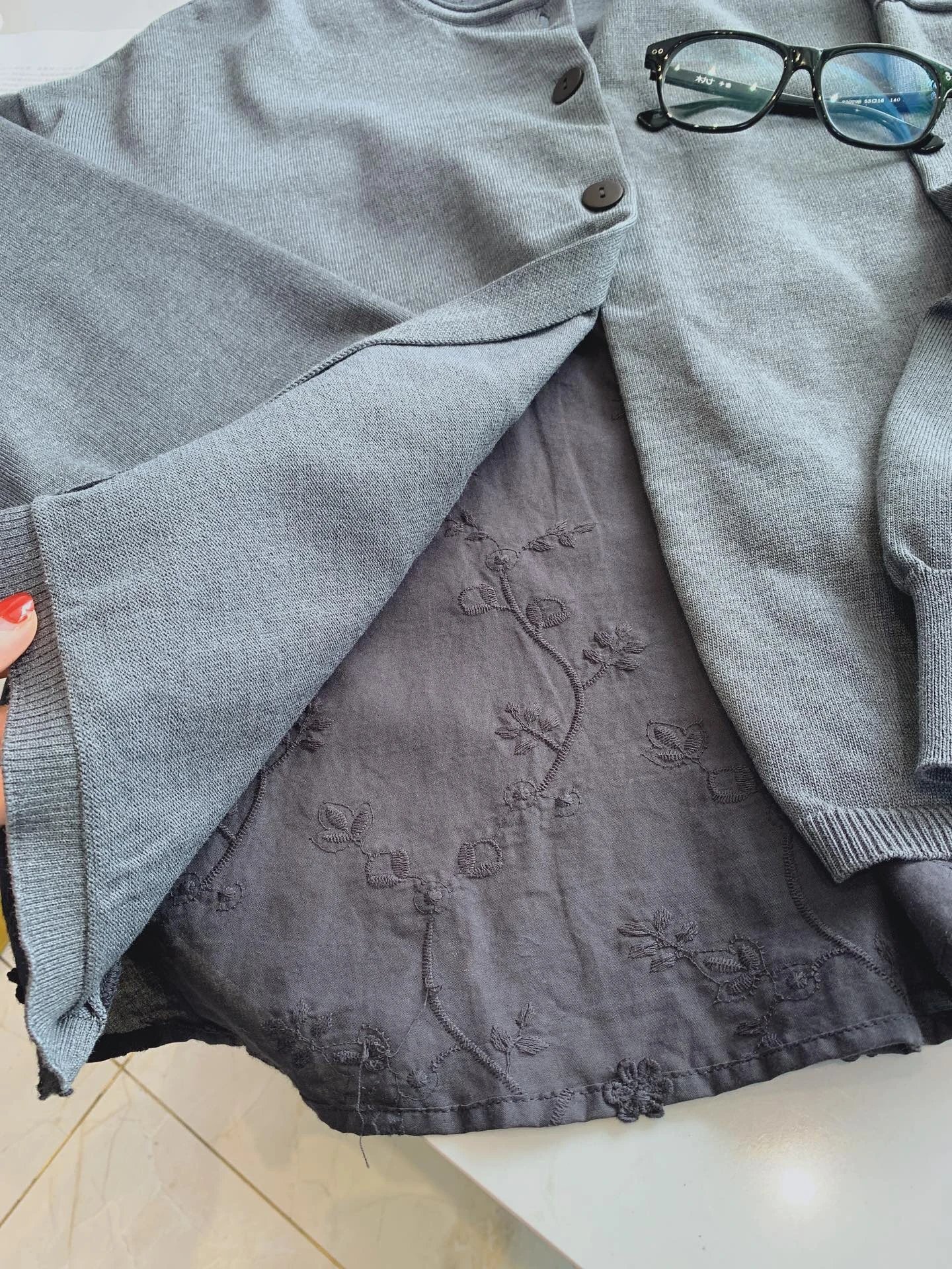 设计感拉满,正面简约圆领+单排扣,温柔又随性背后拼接立体花朵刺绣棉布,层次感直接拉满,走路都带风!