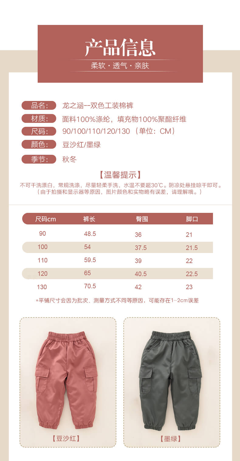 龙之涵双色工装棉裤柔软亲肤