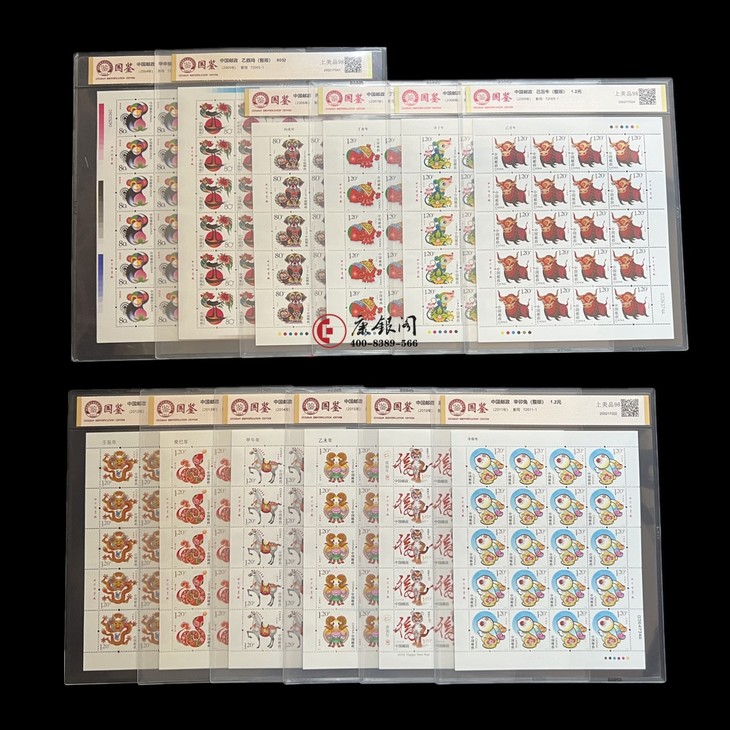 【每版枚数】2004猴、2005鸡每版均为24枚;2006狗、2007猪、2008鼠、2009牛、2010虎、2011兔、2012龙、2013蛇、2014马、2015羊每版均为20枚。