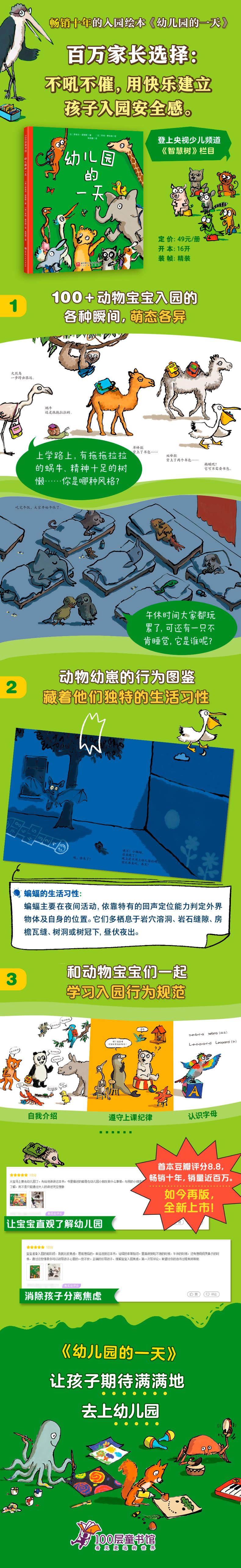 ★ 童趣的幼儿园入学准备绘本,连续多年稳坐法国亚马逊少儿图书榜 ★ 丰富的入园“预体验”,超过60种不同的动物小宝宝逐一亮相,用它们独有的幽默演绎让孩子们轻松理解什么是幼儿园,缓解因陌生而导致的紧张和焦虑,做好入园心理准备