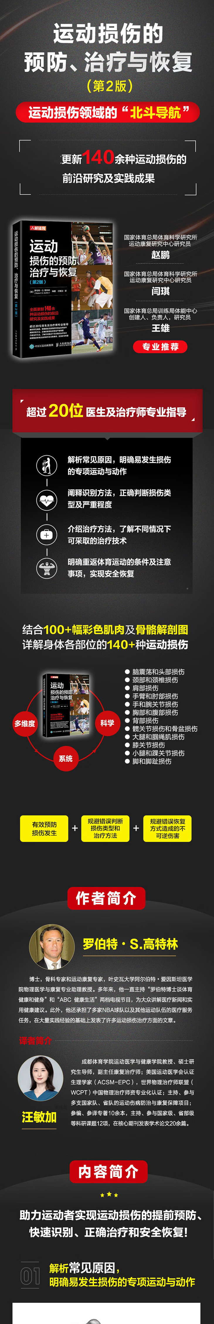 罗伯特·S.高特林 博士,骨科专 家和运动康复专 家,叶史瓦大学阿尔伯特·爱因斯坦医学院物理医学与康复专业助理教授。多年来,他一直主持“罗伯特博士谈体育健康和健身”和“ABC 健康生活”两档电视节目,为大众讲解医疗新闻和实用健康建议。此外,他还承担了多家NBA球队以及其他运动队伍的医疗服务任务,在大量实践经验的基础上发表了许多运动损伤治 疗方面的文章。 汪敏加 成*体育学院运动医学与健康学院教授、硕士研究生导师,副主任康复*师;美国运动医学会认证生理学家(ACSM-EPC),世界物理*师联盟(WCPT)中国物理*师资专业化认证;主持、参与多支国家队、省队的运动伤病防治与康复保障项目;参编、参译专著10余本,主持、参与*、省部级等科研课题12项,在核心期刊发表学术论文20余篇。