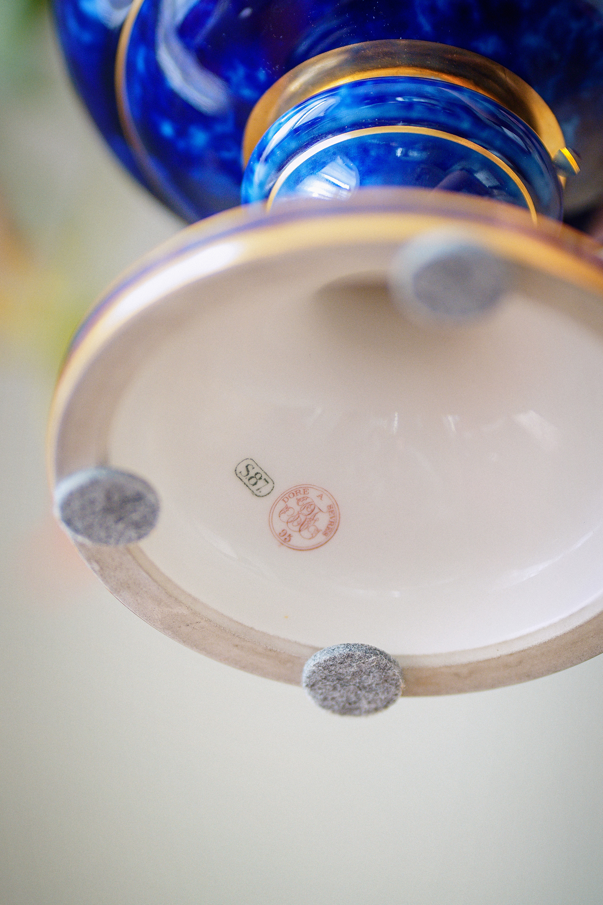 【已售】独角鹿西洋古董1887-1895年代法国御窑塞弗尔签名出品手绘描金装饰云朵蓝釉美第奇樽造型瓷花瓶