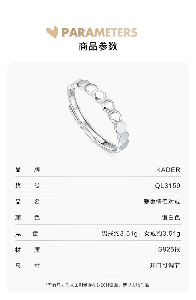 KADER卡蒂罗 爱巢情侣对戒 S925银甜蜜蜂巢设计开口可调节素戒一对 简约大气氛围感配饰 男女同款情侣款 礼盒