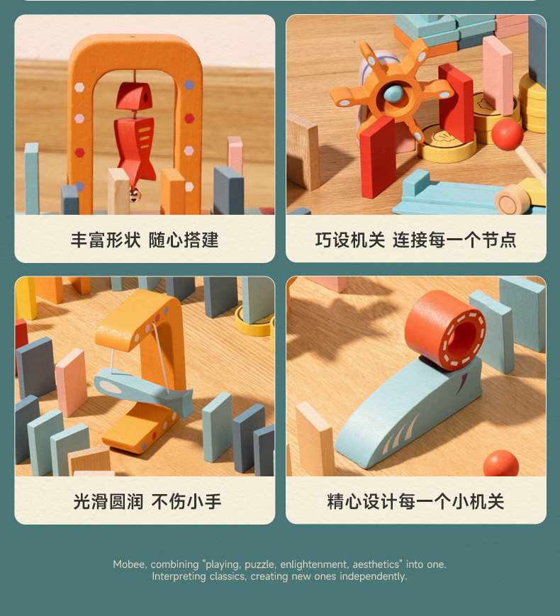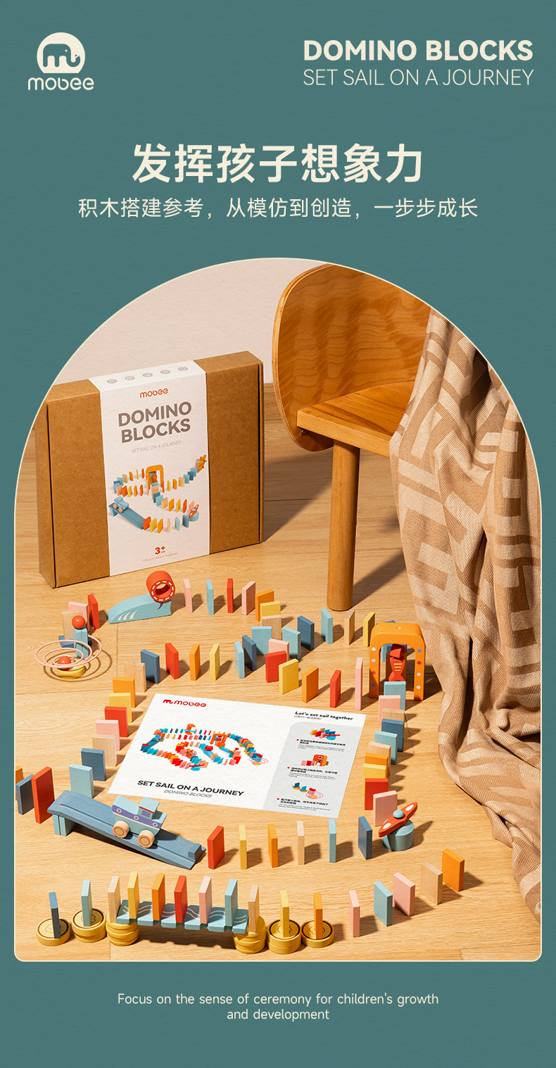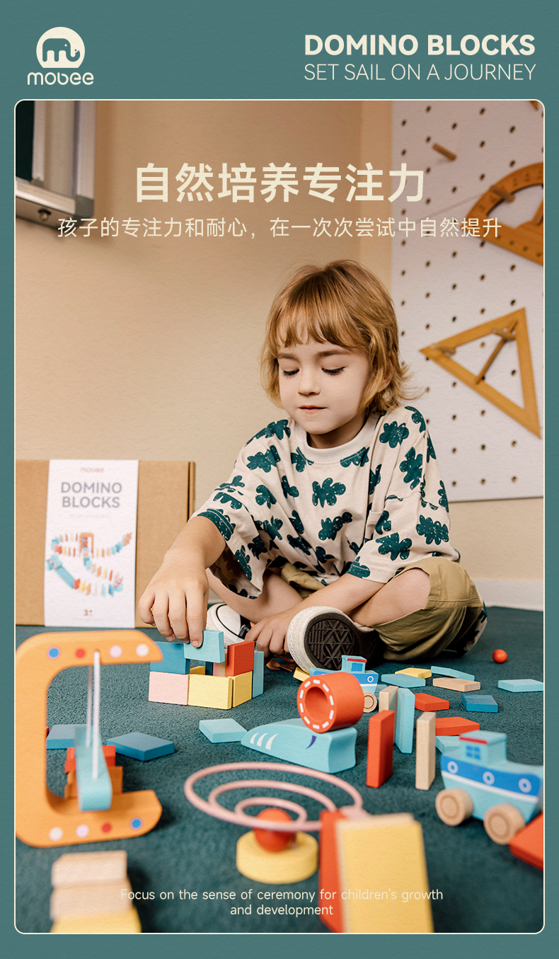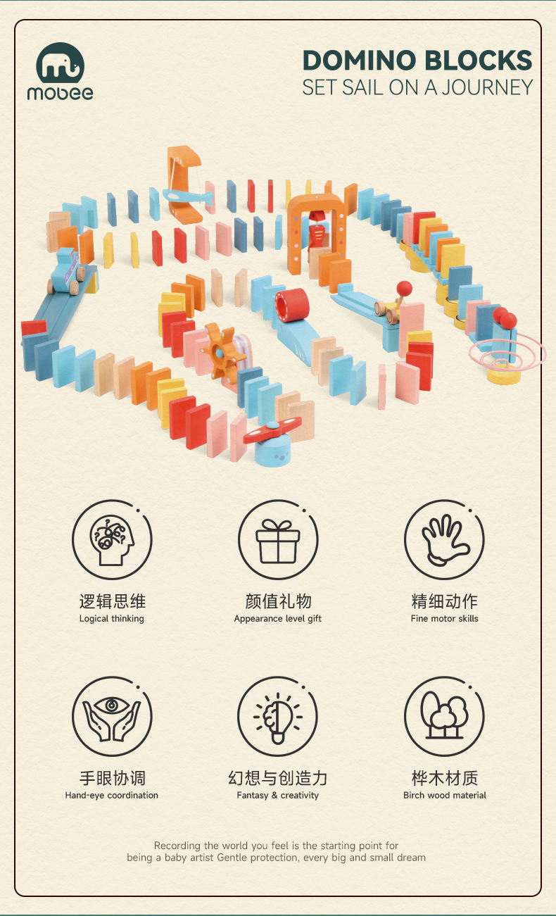 【15种关卡百变拼搭 培养专注力】 mobee航行远游多米诺积木122pcs 天然桦木环保染料 边玩边练专注力 儿童益智玩具早教礼物