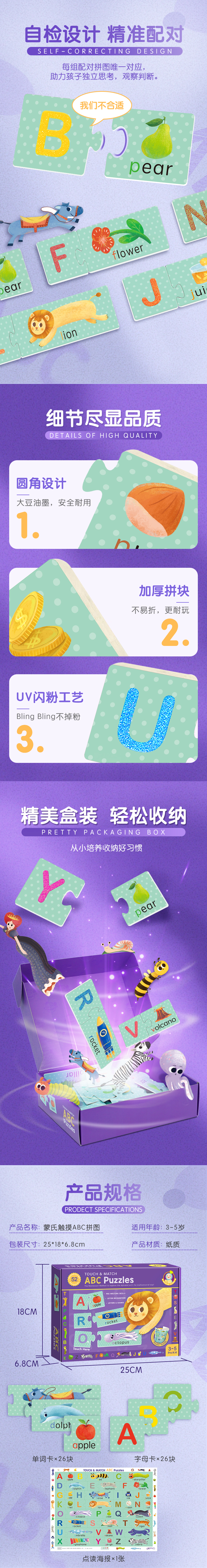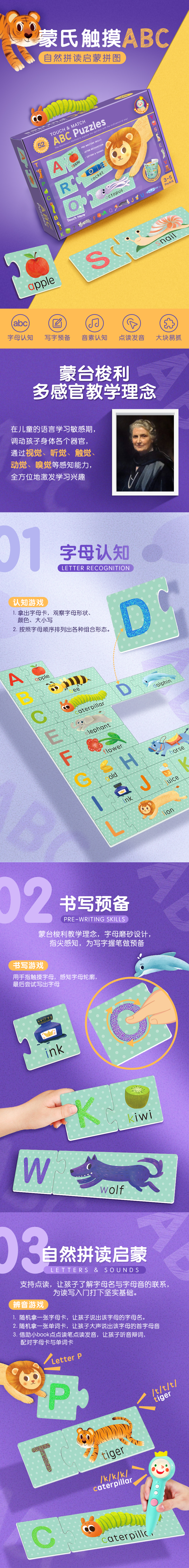 集拼图+触摸+点读于一身,调用视觉、触觉和听觉,把蒙台梭利体系中经典的多感官教学融入这套拼图,让娃学会字母认读、字母拼写、音素认读