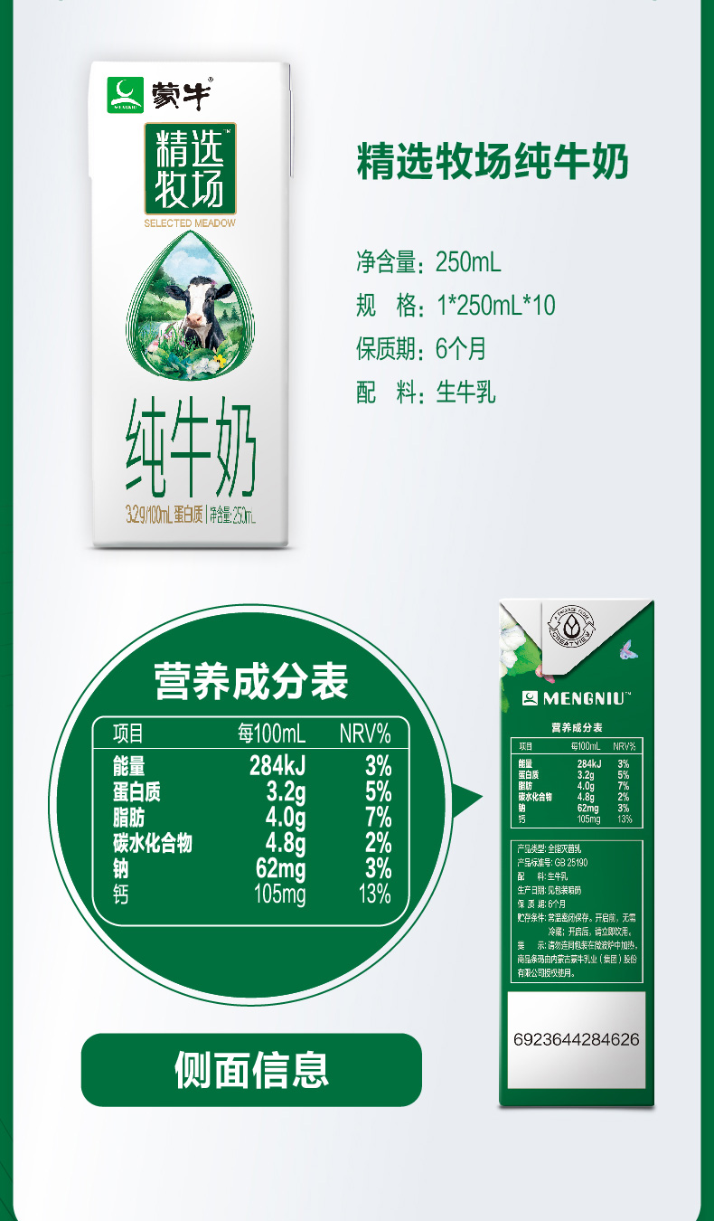 蒙牛精选牧场纯牛奶全脂灭菌乳利乐苗条装250ml×10包 1月
