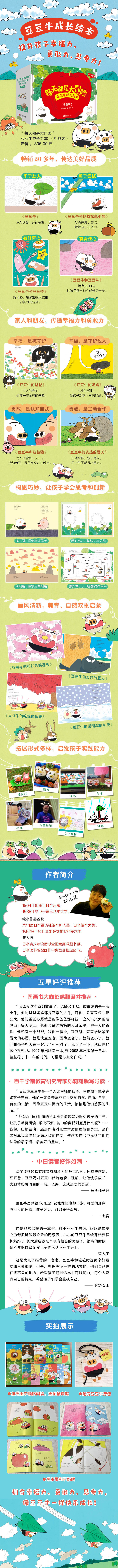 《“每天都是大冒险”豆豆牛成长绘本》这套书一共13本,讲述了豆粒一样大的豆豆牛的幸福生活。《豆豆牛》介绍了豆豆牛是谁,他如何喜欢冒险、如何热爱生活。《豆豆牛的爸爸》《豆豆牛的妈妈》《豆豆牛和豆豆妹》《豆豆牛和豆豆爷》《豆豆牛和豆豆奶》介绍了豆豆牛幸福的一家,教孩子认识家人的爱,增强幸福力和责任感。《豆豆牛和粒粒猪》《豆豆牛和蚂蚁松鼠小妹》讲述了豆豆牛的两个好朋友,教孩子珍惜友谊,认知自我。《豆豆牛的粉红色的春天》《豆豆牛的炎热的夏天》《豆豆牛的吃惊的秋天》《豆豆牛的圆溜溜的冬天》讲述了豆豆牛经历的一年四季,让孩子热爱自然,习得耐心和观察力。《豆豆牛的圣诞节》讲述了大家的愿望,豆豆牛的愿望则是“要大家的愿望全部实现!”