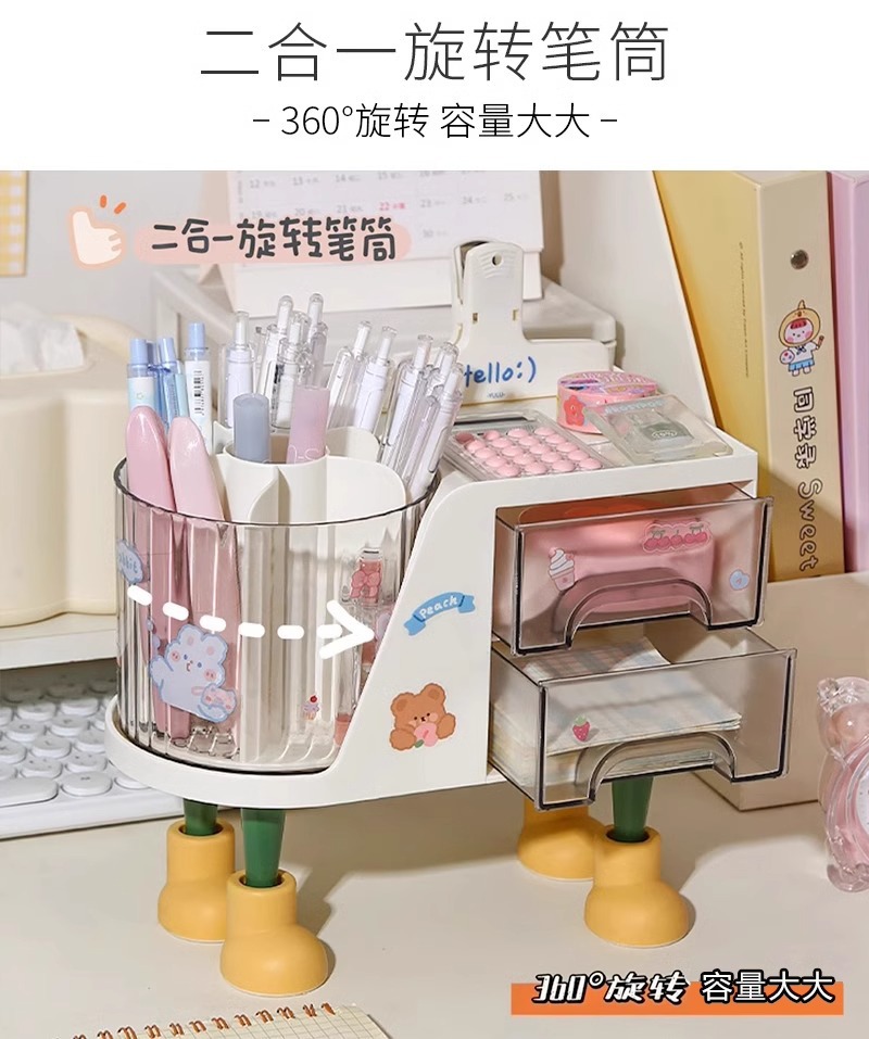 赠送贴纸【巨大容量!二合一旋转笔筒收纳】笔筒可单独拆卸使用,桌面大容量旋转笔筒学生创意书桌学生收纳盒办公室轻奢高级置物架。rc