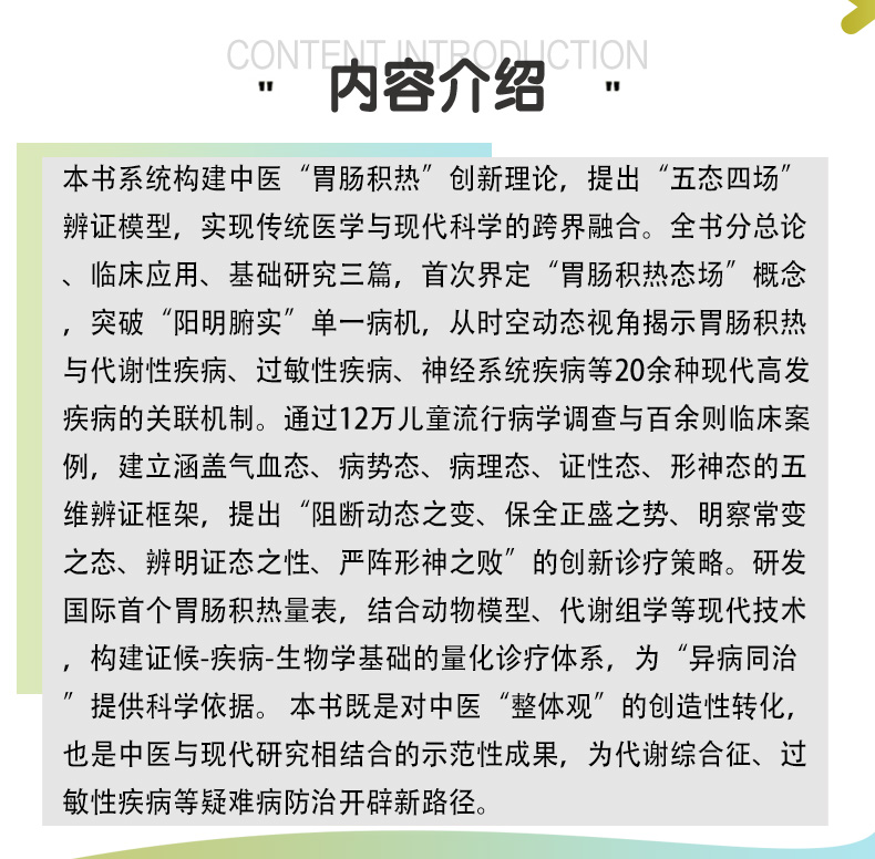 本书系统构建中医“胃肠积热”创新理论,提出“五态四场”辨证模型,实现传统医学与现代科学的跨界融合。全书分总论、临床应用、基础研究三篇,首次界定“胃肠积热态场”概念,突破“阳明腑实”单一病机,从时空动态视角揭示胃肠积热与代谢性疾病、过敏性疾病、神经系统疾病等20余种现代高发疾病的关联机制。通过12万儿童流行病学调查与百余则临床案例,建立涵盖气血态、病势态、病理态、证性态、形神态的五维辨证框架,提出“阻断动态之变、保全正盛之势、明察常变之态、辨明证态之性、严阵形神之败”的创新诊疗策略。研发国际首个胃肠积热量表,结合动物模型、代谢组学等现代技术,构建证候-疾病-生物学基础的量化诊疗体系,为“异病同治”提供科学依据。 本书既是对中医“整体观”的创造性转化,也是中医与现代研究相结合的示范性成果,为代谢综合征、过敏性疾病等疑难病防治开辟新路径。