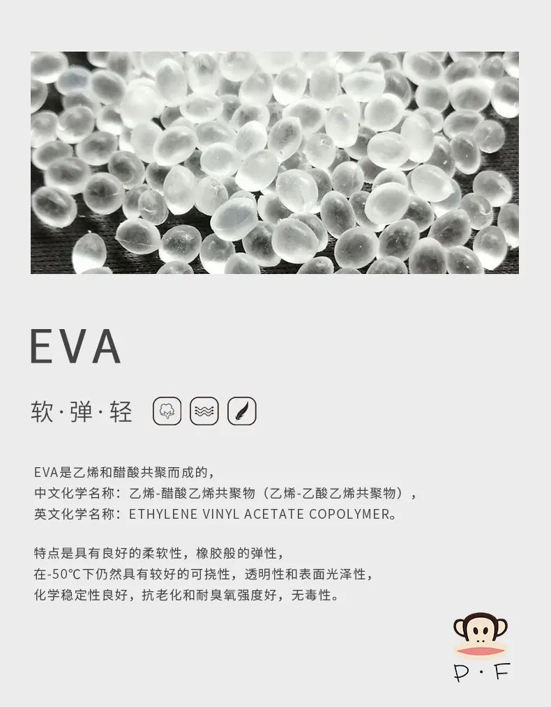 (EVA是新型的缓震材料,很多高端跑鞋、旅游登山鞋都会用EVA做鞋底)