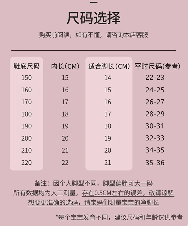 拖鞋做了150-220的尺码,适合22-36码的小脚丫,大家选择的时候可以测量下孩子脚长,按照脚长+1厘米选择内长即可