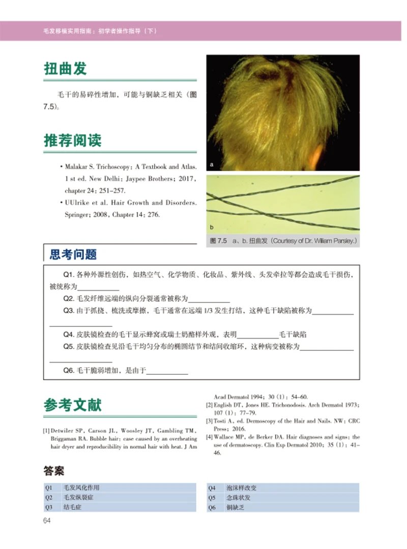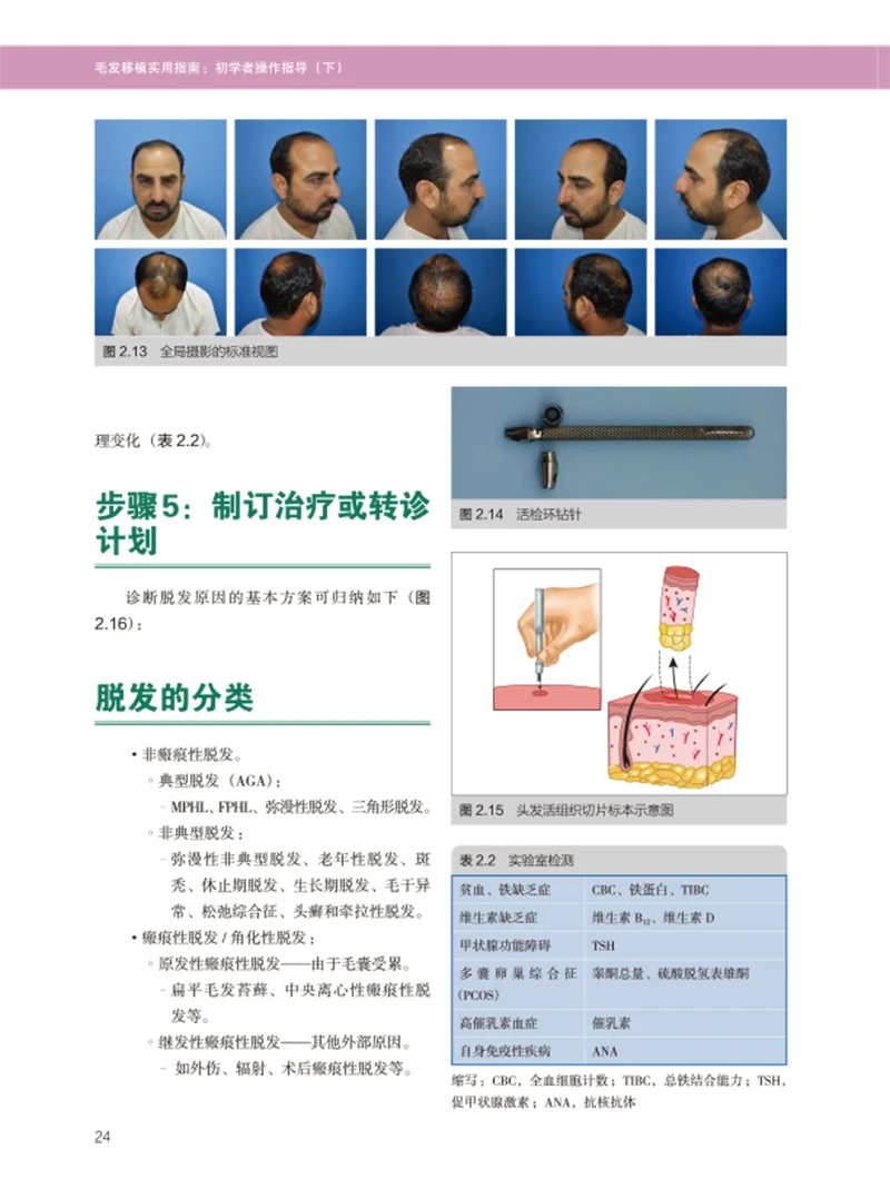 本书由国际上知名毛发移植医生编写,汇集了他们的临床经验,对毛发移植医生很有帮助。 本书分为上下两册,本册为下册,分为两篇: 第一篇介绍成为一名出色的毛发移植外科医生所需的基础知识,包括毛发基础科学、脱发的诊断和鉴别诊断、诊断所需使用的工具、脱发的药物治疗(包括非那雄胺、米诺地尔和其他药物治疗),以及营养支持等相关内容。本篇末尾还介绍了毛发移植手术过程中紧急情况的诊断和管理,以及如何创建一家毛发移植诊所等内容。 第二篇对于初学者来说内容有些过于深奥,主要介绍了该领域非常重要的前沿知识;随着初学者技能的提升和知识的增长,这些前沿知识也是必须要掌握的。本篇相关内容有头皮微着色文饰、体毛移植、非头皮部位的毛发移植、创伤性秃发患者的毛发移植、FUT和FUE的联合应用、毛发与体毛的联合移植、毛发移植术后修复方法、不剃发FUE技术、FUT长发移植和FUE长发移植等。本篇是由毛发移植领域的著名专家和前辈们所编写的,加格医生和我非常感谢他们的贡献。 本册是上册的实践应用,与上册内容可分开阅读,但若想掌握毛发移植的操作,上下两册都需要学习,本册配有视频,可以在THIEME官方网站上观看,视频详细讲解了毛发移植的具体操作,对理解术中的文字内容非常有帮助。