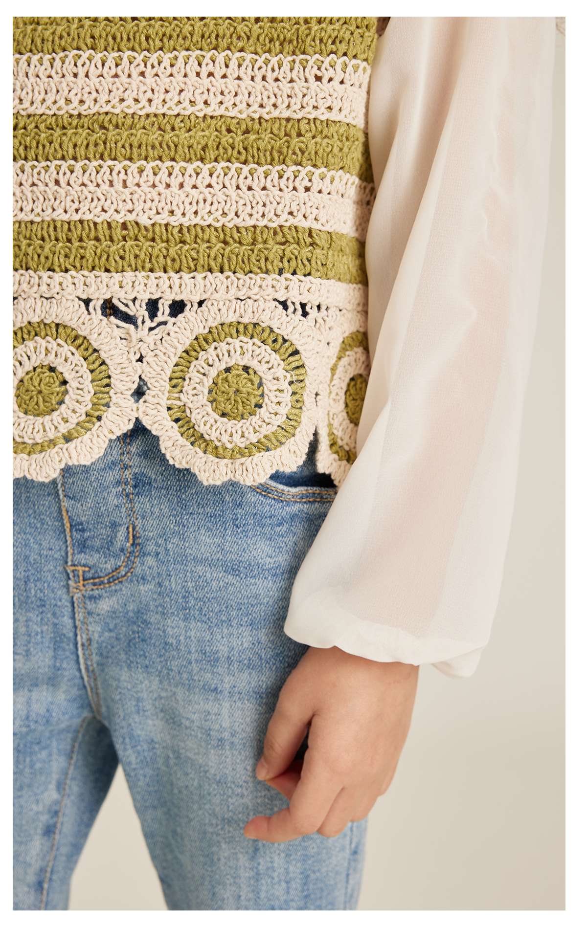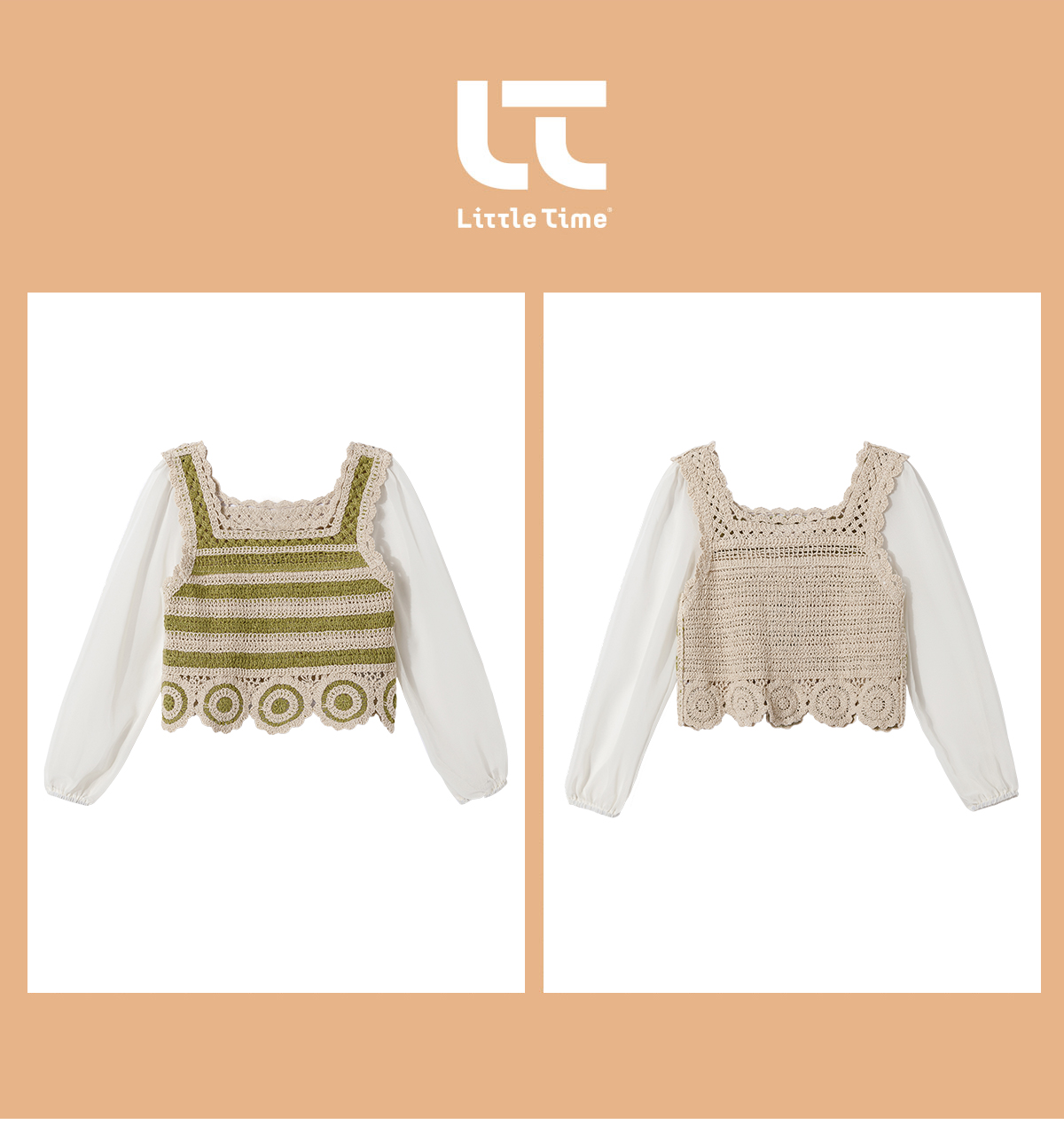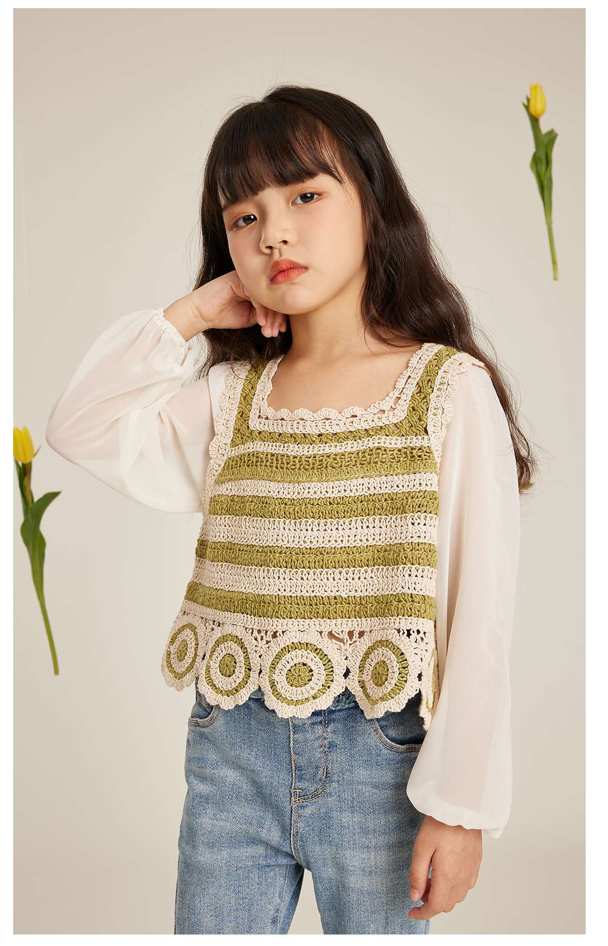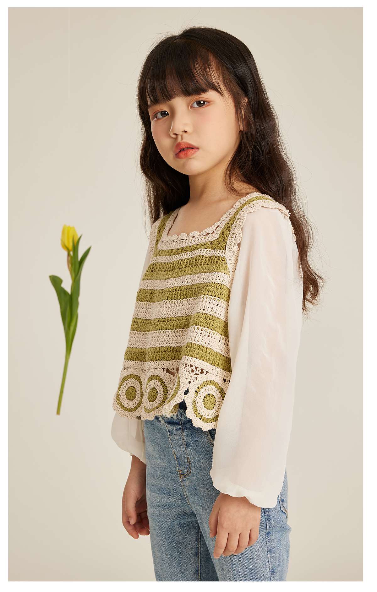 littletime女童法式文艺长袖衬衫2023春秋新款针织钩针衬衫上衣