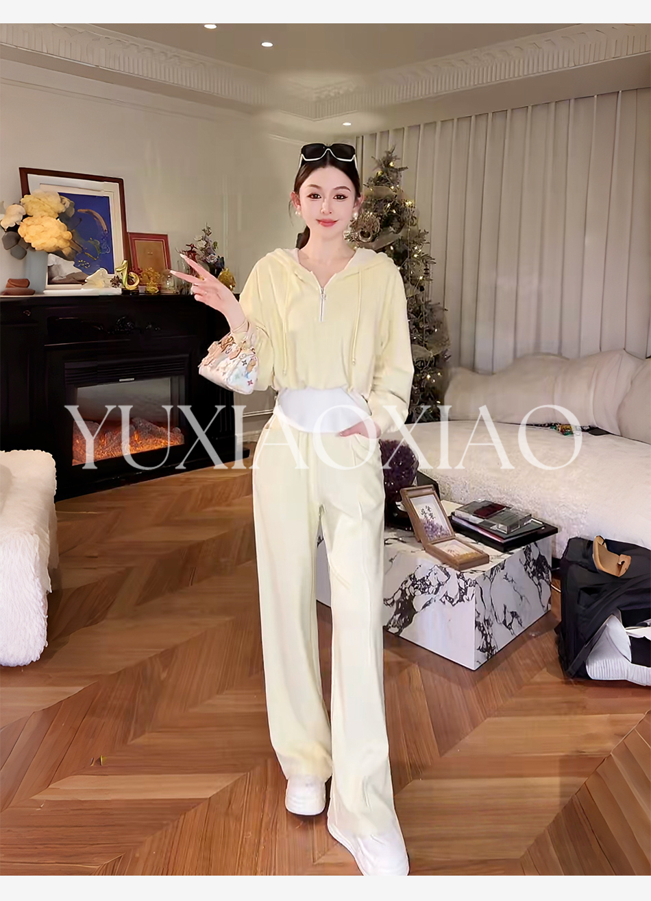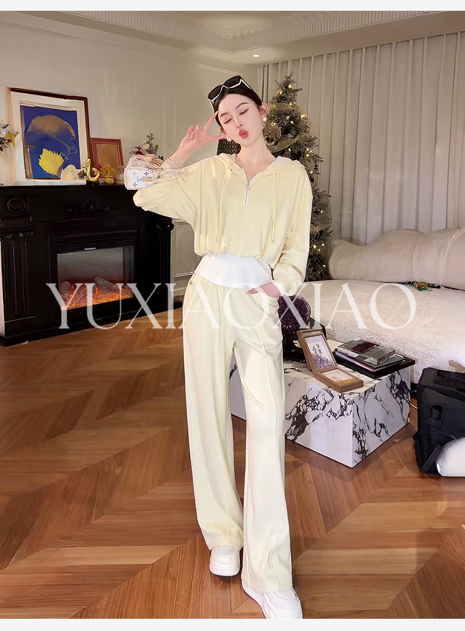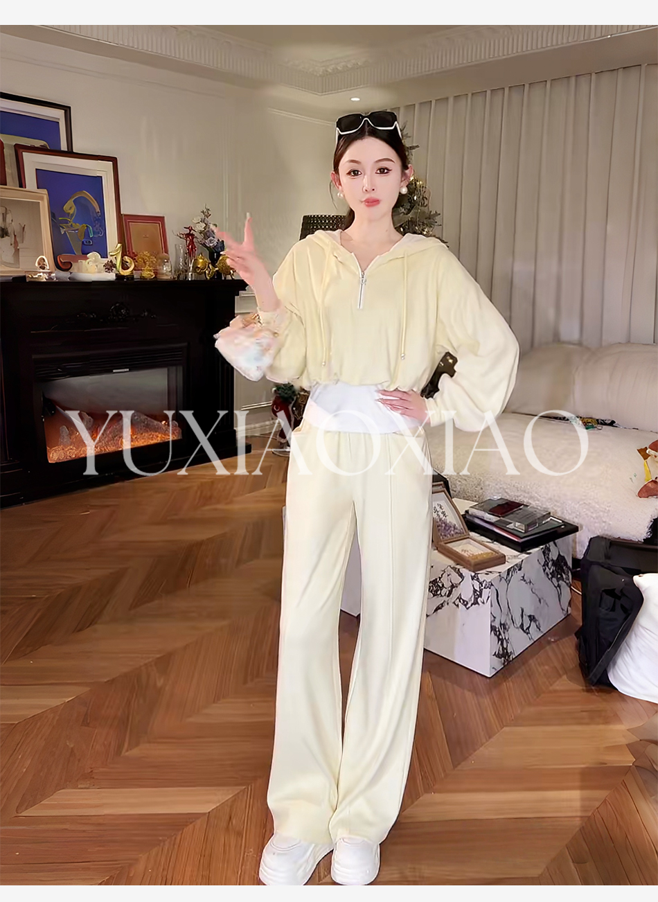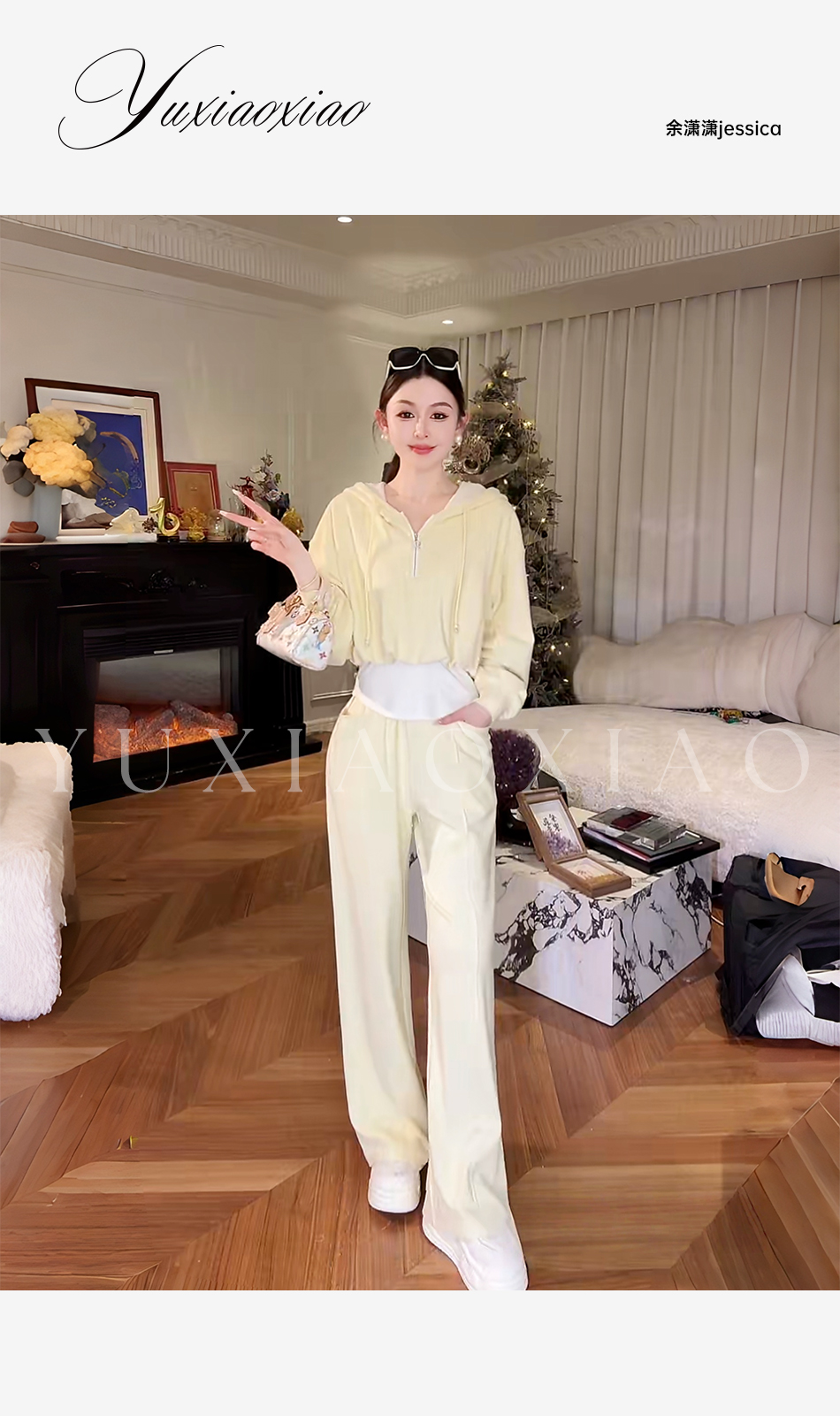 余潇潇【香草奶昔】时尚连帽拼接下摆假两件卫衣&直筒休闲裤套装