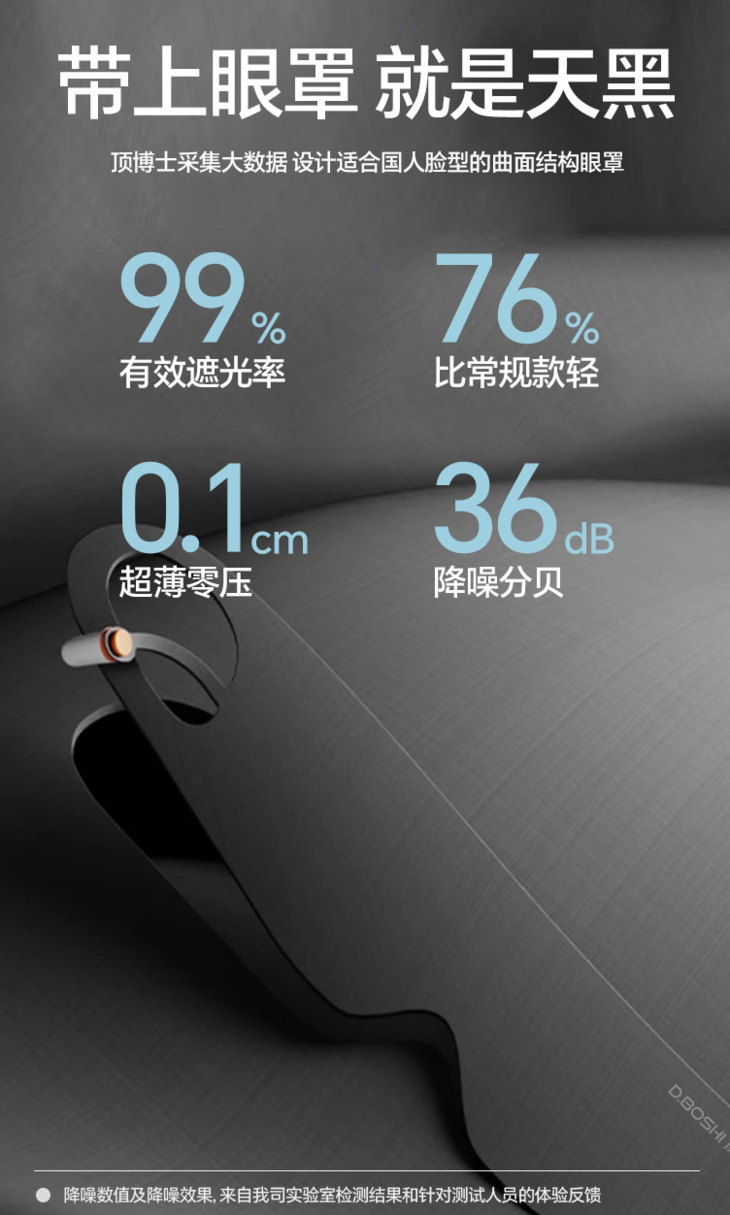 降噪二合一 强效遮光,轻薄透气亲肤,贴合脸型 营造安静舒适环境,提升睡眠质量 99%遮光率 即使是午后的阳光,也无法透过它影响你的休息。 能将你带入理想的黑暗环境,不管你是在飞机上,还是在办公室,都能迅速进入深度休息状态。