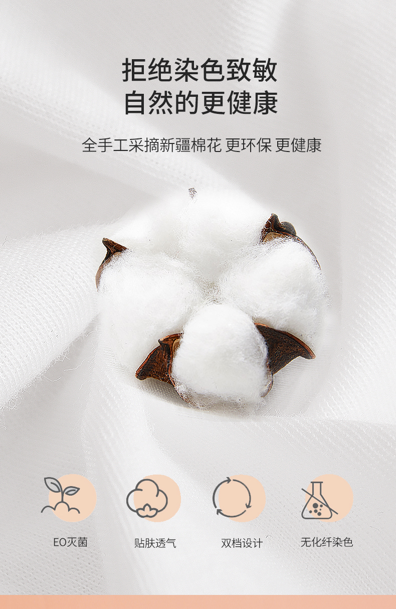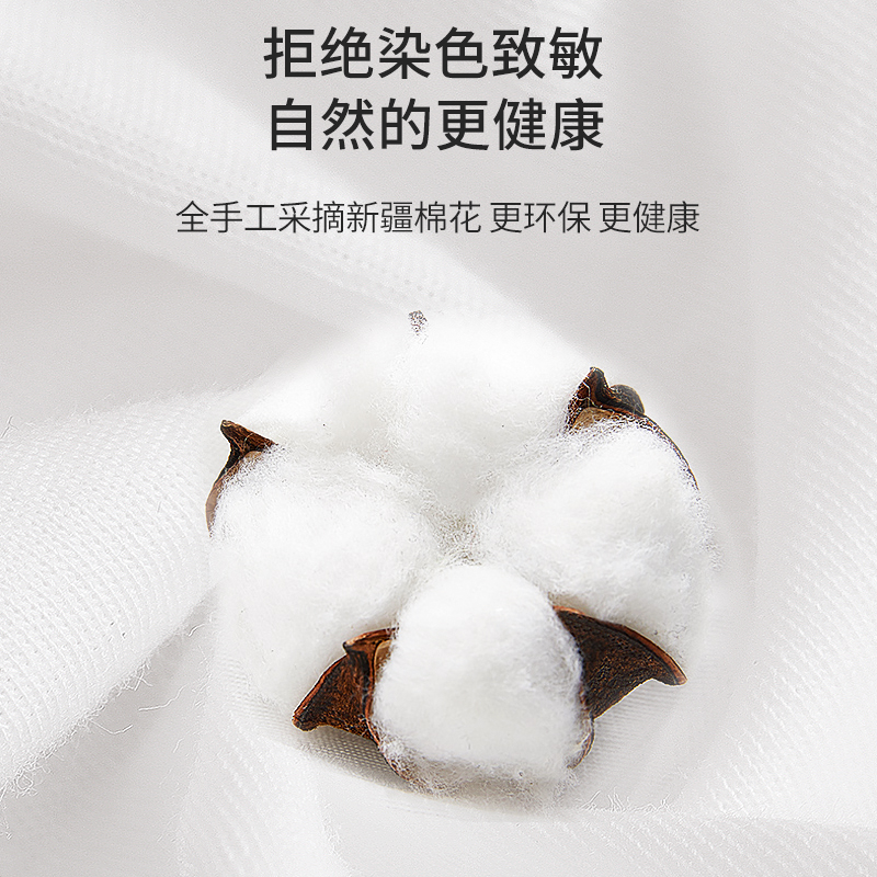 2.100%纯棉面料,精梳棉工艺,密度厚实,棉质细腻 ,亲肤透气,做工精细,走线平整,环氧乙烷杀菌处理,环保健康!