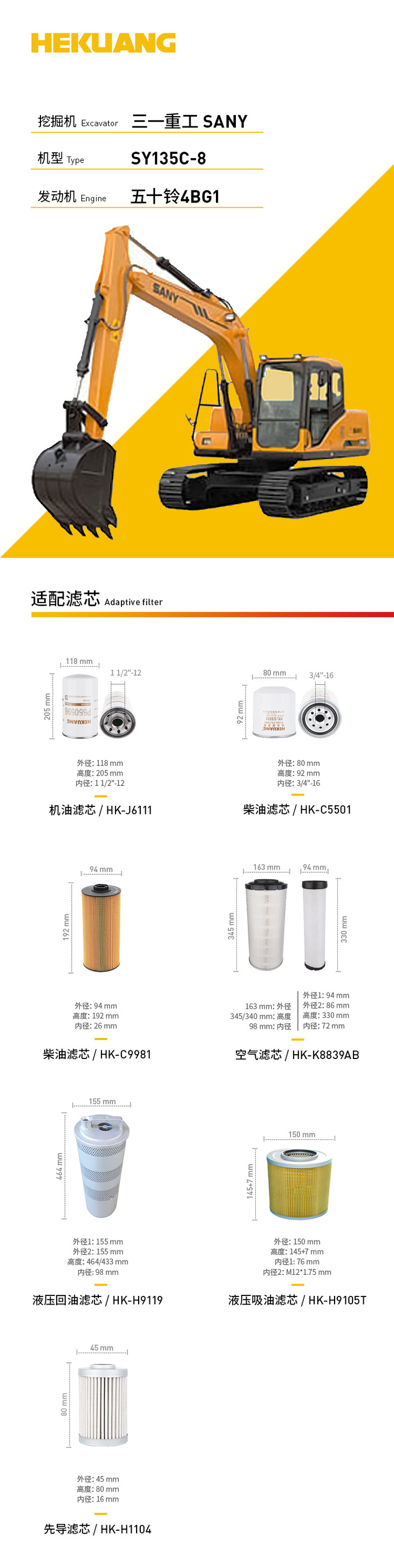 三一重工SY135C-8(五十铃4BG1)挖掘机适配滤芯 机柴滤芯 液压油吸油回油滤芯 空气滤芯 先导滤芯