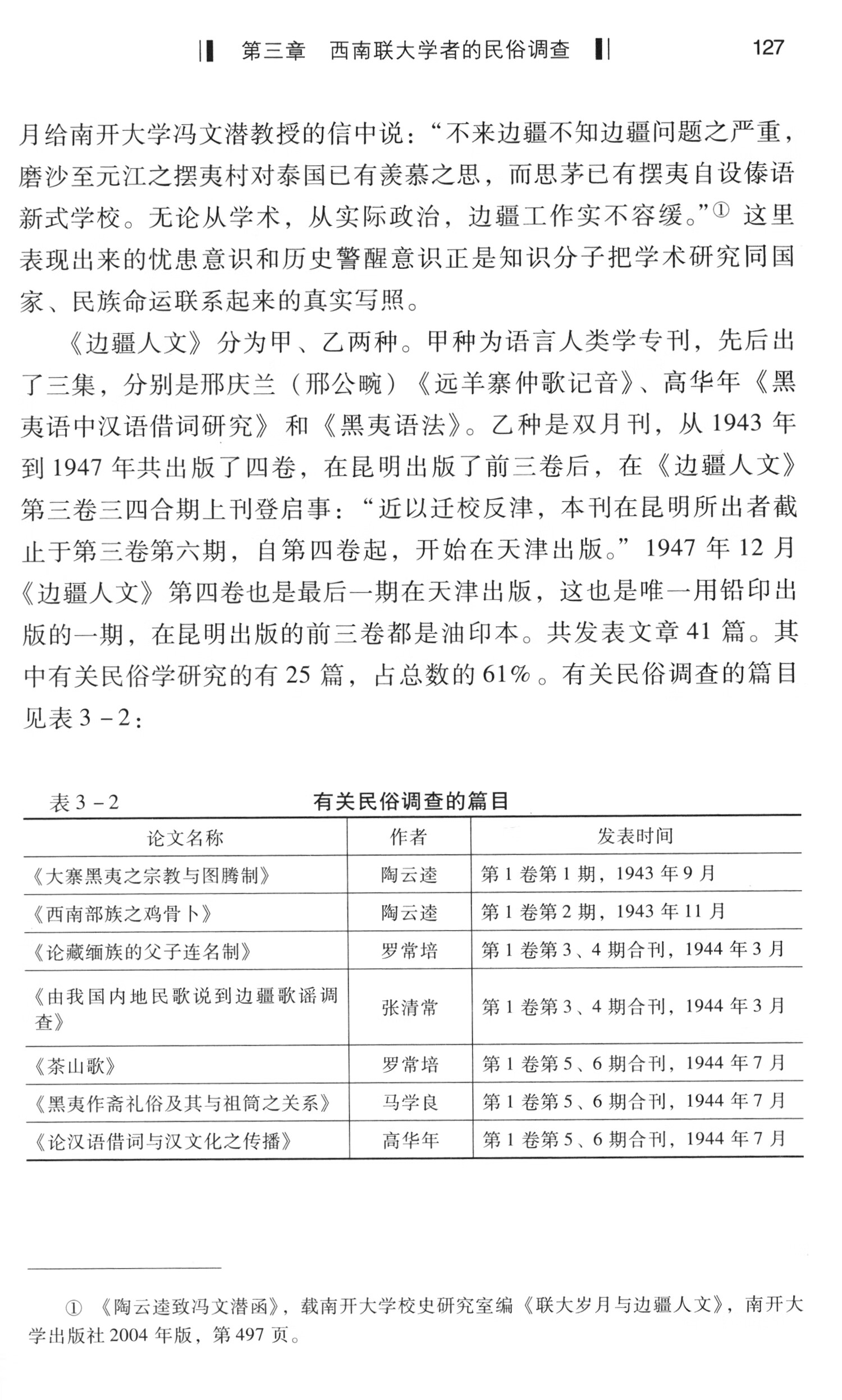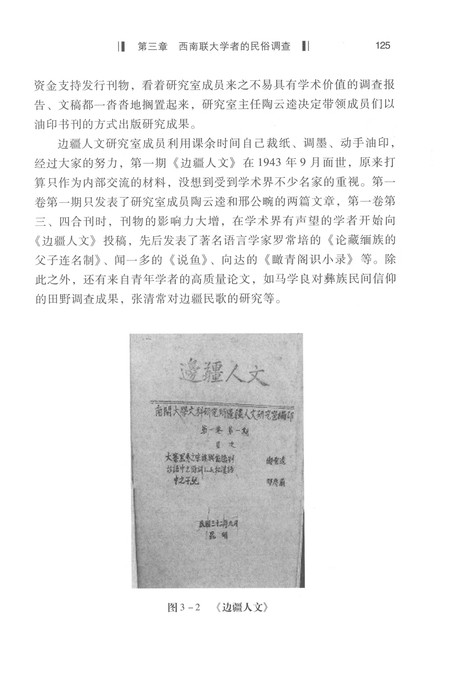 云南是一个诞生民俗学家的地方,也是中国民俗学理论生产和不断发明发现的地区,丁文江、江应梁、杨成志、方国瑜、陶云逵、吴文藻、吴泽霖、费孝通、李景汉、岑家梧、林耀华、田汝康、许娘光、李方桂、罗常培、马学良、李霖灿、邢公畹以及国外学者鸟居龙藏、约瑟夫·洛克等的身影活跃在云南不同民族的村寨;“边疆人文研究室”及《边疆人文》、“魁阁”研究室、滇黔苗族民俗调查、《西南采风录》《芒市边民的摆》《金沙江上的情歌》《倮文作祭献药供牲经译注》等学术团体和著作源于学人的调查和研究。这些在现代中国学术史上闪耀的名字、学术组织和学术著作从不同的方面影响了云南多民族民俗生活和文化传统的知识生产,也推进了中国民俗学理论建设。尽管这些学人的学科背景不同,调查目标不一样,但是,他们均对中国民俗学和民间文学的理论建设贡献了非凡的智慧。诚如著作中谈到的那样:“抗战时期,作为民俗学发展的一个特殊阶段。战争致使教学与研究偏于一隅、资料图书匮乏等种种不便,但并没有阻碍边疆开发与边政研究的勃兴、与之相关的学术活跃和学科交流互动的局面。具体表现为:民族意识的空前高涨带来对民族文化的高度重视和广泛探讨,‘边疆社会’、‘后进民族’、‘下层民众’成为各个学科关注的对象;学者们迈出书斋走向民间,社会学、人类学、民俗学、历史学以及文学等多学科理论与方法综合打通、交叉互补,为解决实际问题的‘边政学’打下了基础,也为民俗文化研究铺就了道路。”