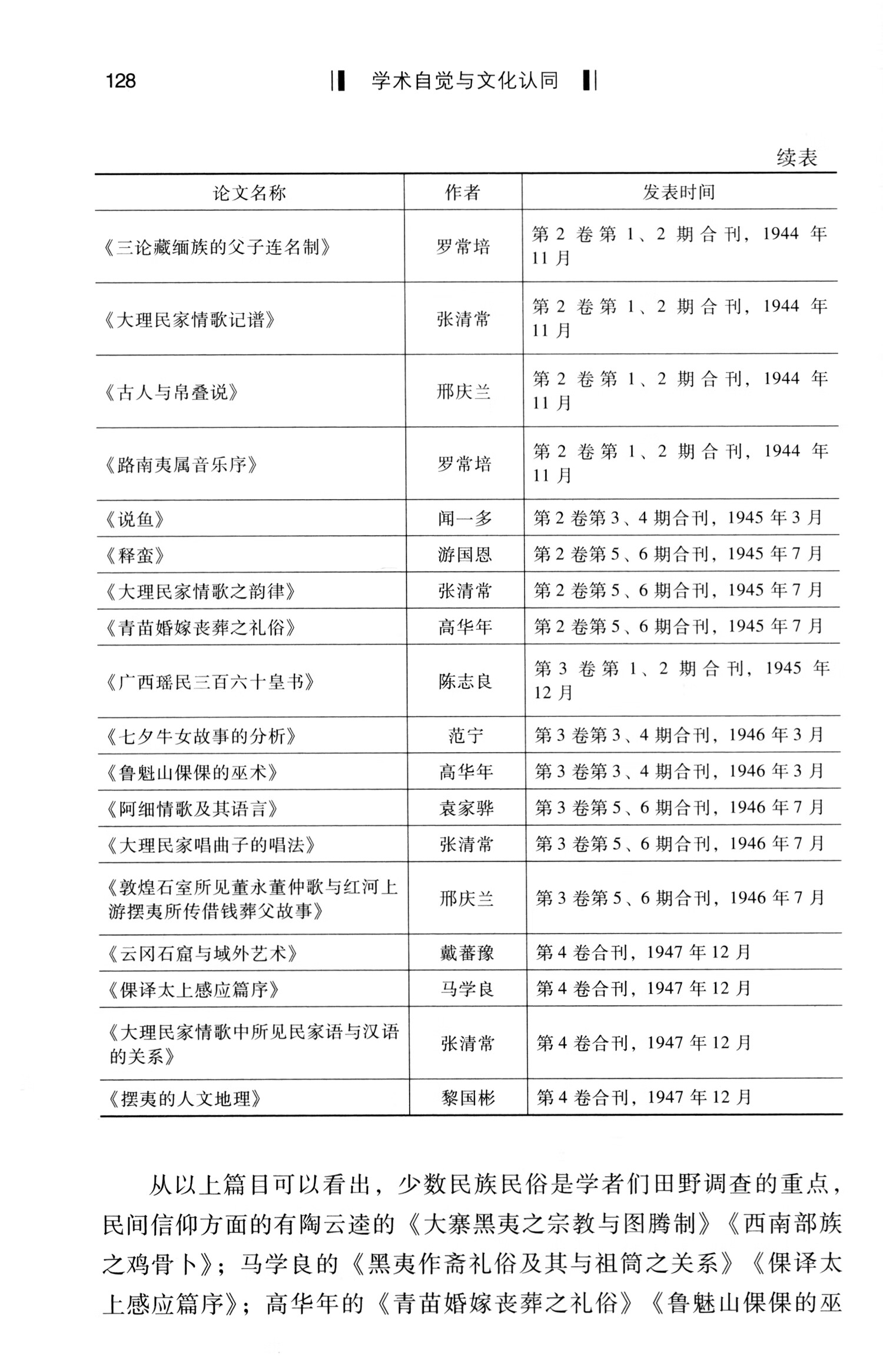 应该说,刘薇博士的《学术自觉与文化认同:云南民俗文化调查研究(1937-1945)》将抗战时期的云南民俗调查研究推到一个新的高度,并且在中国民俗学发展史上具有重要的价值。可贵之处在于该书把抗日战争时期民俗作为重要的学术活动和生活实践来讨论,将云南作为中国民俗学发展的特殊区域,抗日战争作为特殊时期的表现开展研究,并且将民俗看作抗日战争时期中国社会历史和民众生活的一部分,看作中国民俗学学术研究以及相关学科研究历史的一部分,这是难得的学术发现。