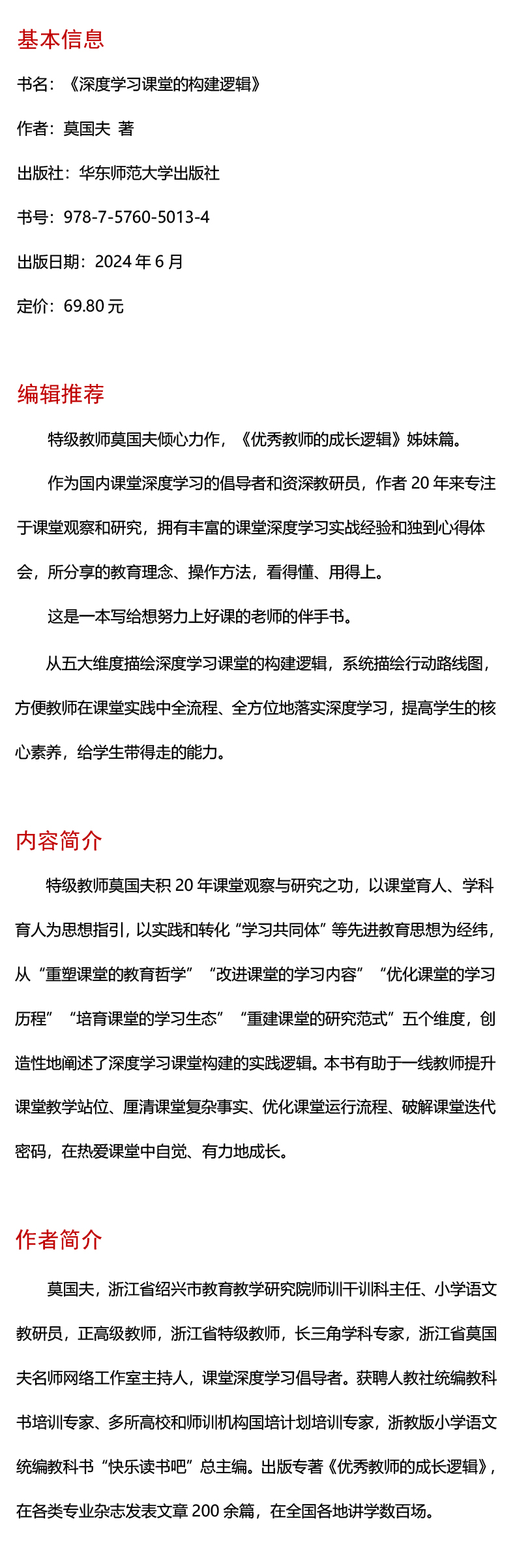 ·特级教师莫国夫倾心力作,《优秀教师的成长逻辑》姊妹篇。·作为国内课堂深度学习的倡导者和资深教研员,作者20年来专注于课堂观察和研究,拥有丰富的课堂深度学习实战经验和独到心得体会,所分享的教育理念、操作方法,看得懂、用得上。·这是一本写给想努力上好课的老师的伴手书。·从五大维度描绘深度学习课堂的构建逻辑,系统描绘行动路线图,方便教师在课堂实践中全流程、全方位地落实深度学习,提高学生的核心素养,给学生带得走的能力。