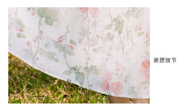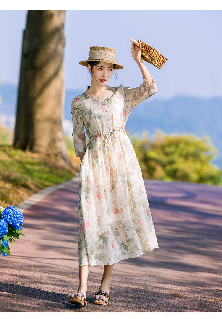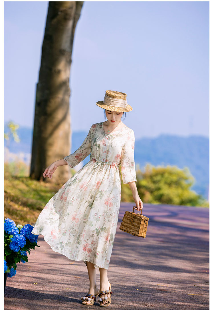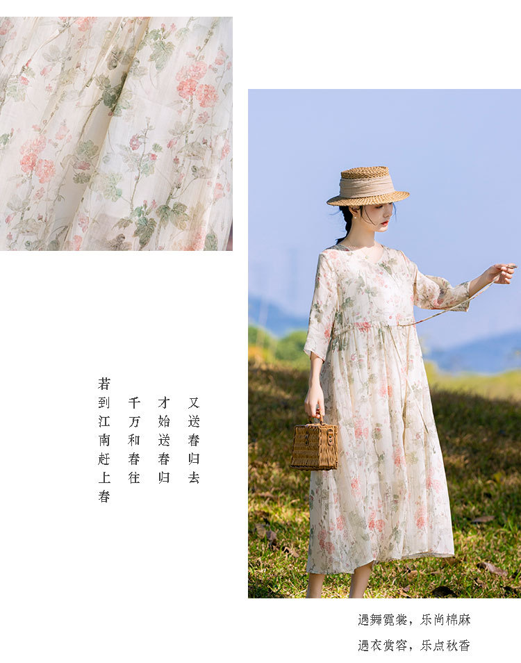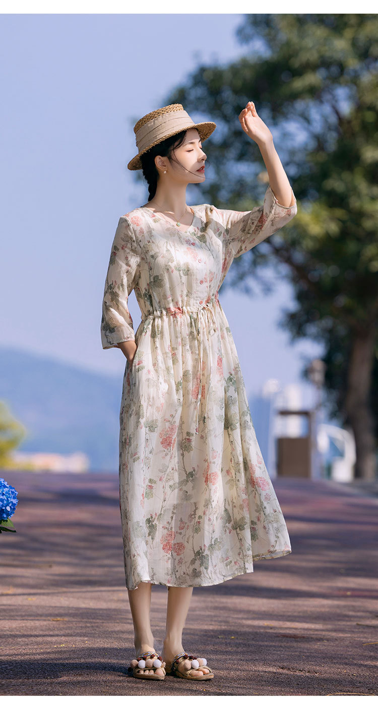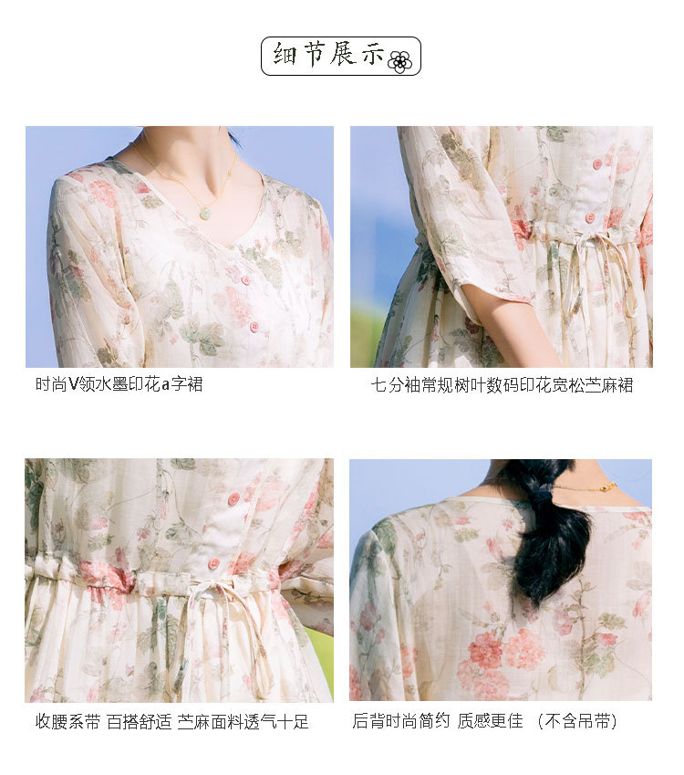 新中式棉麻苎麻连衣裙,V领国风复古改良旗袍TT96153