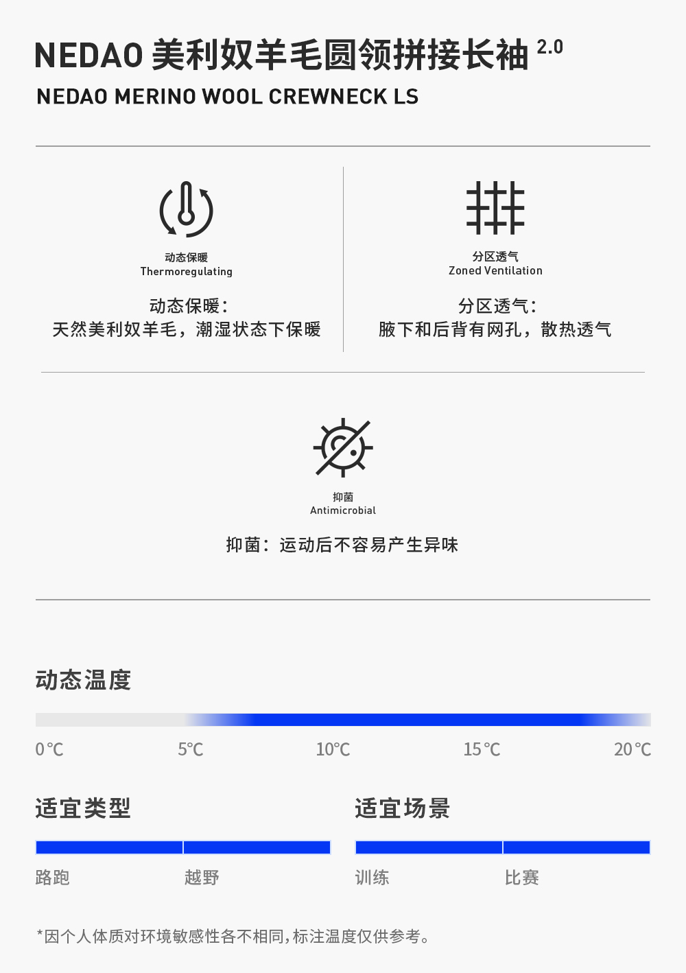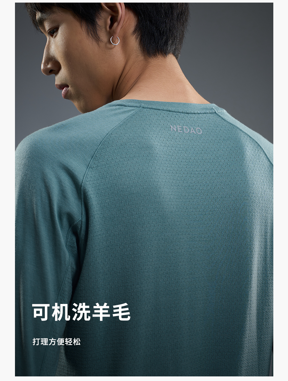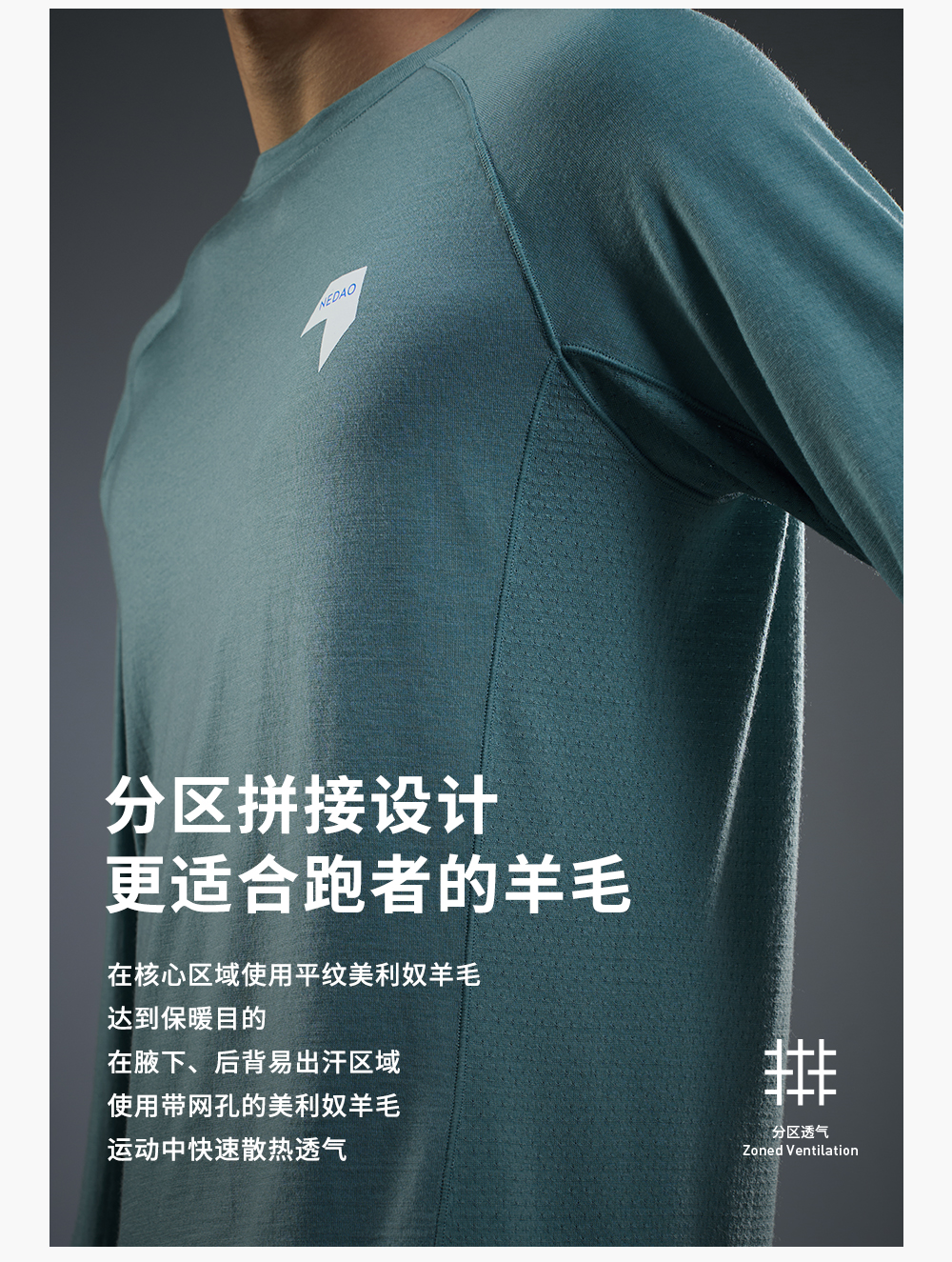 内道美利奴羊毛圆领拼接长袖男女同款吸汗透气网孔越野跑步t