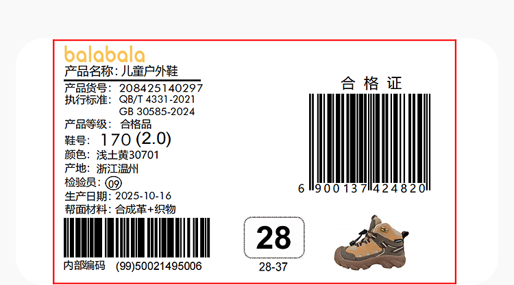 巴拉巴拉童鞋儿童户外鞋男女童2025年新款秋冬户外时尚舒适百搭