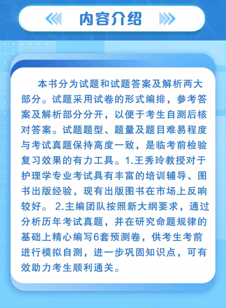 本书分为试题和试题答案及解析两大部分。试题采用试卷的形式编排,参考答案及解析部分分开,以便于考生自测后核对答案。试题题型、题量及题目难易程度与考试真题保持高度一致,是临考前检验复习效果的有力工具。1.王秀玲教授对于护理学专业考试具有丰富的培训辅导、图书出版经验,现有出版图书在市场上反响较好。