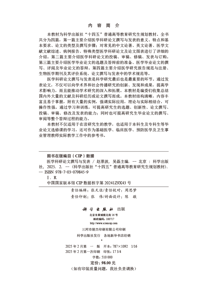 医学科研论文撰写与发表 十四五普通高等教育研究生规划教材 赵景波 吴磊编 供基础研究生临床研究生预防及管理研究生 科学出版社
