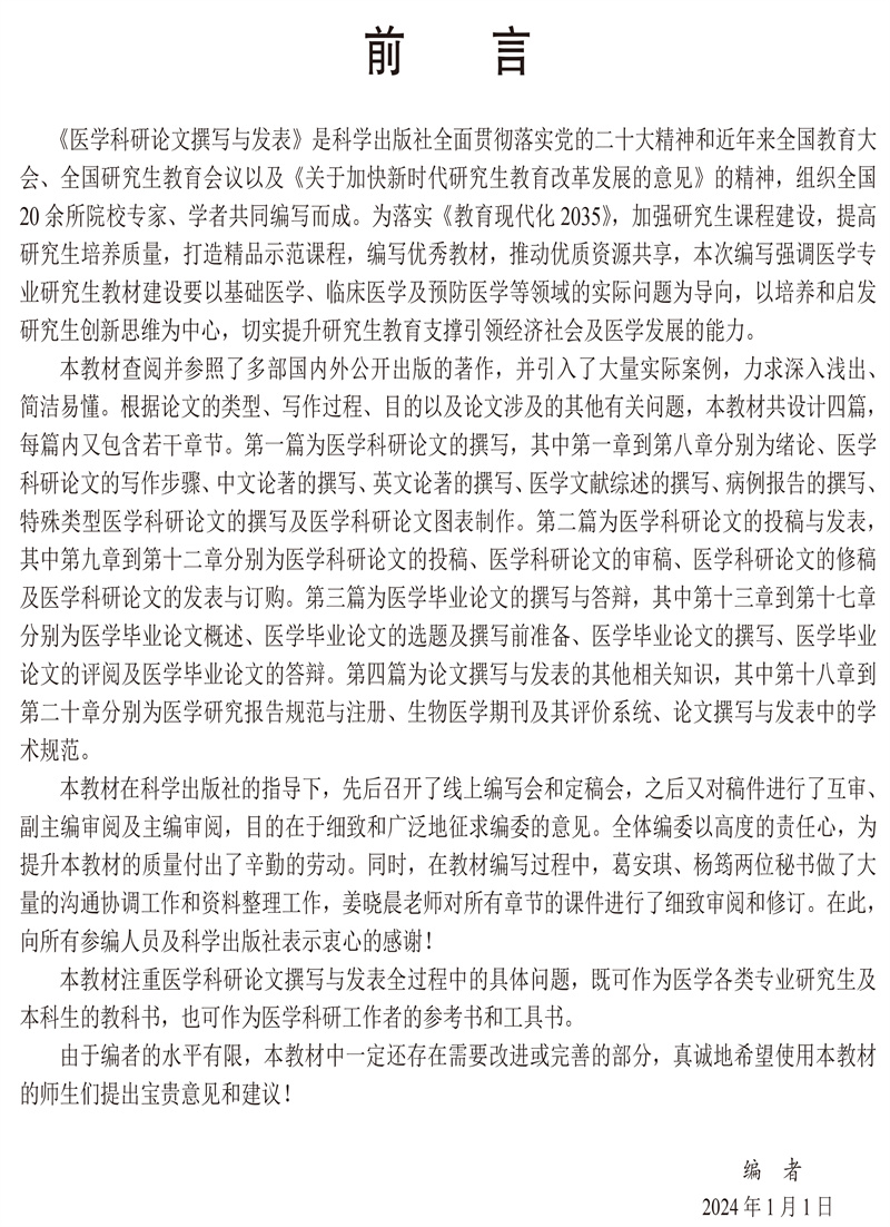 医学科研论文撰写与发表是科学研究最后也是最重要的环节。通过发表论文,不仅可以向学术界和社会传播研究的创新、发现和成果,提高学术影响力,而且能推动学术研究的深入和拓展。本教材是编委们收集总结国内外大量的文献及科研经历或论文撰写而成。本教材结构清晰,内容丰富且易于掌握,附有大量的实例,强调实际应用,理论与实际相结合,可操作性强。通过学习和训练,可提高研究生的选题、创新性、论文撰写、投稿、审稿、修改及发表的能力;同时也可提高研究生毕业论文的撰写、审阅等整个答辩过程的能力。