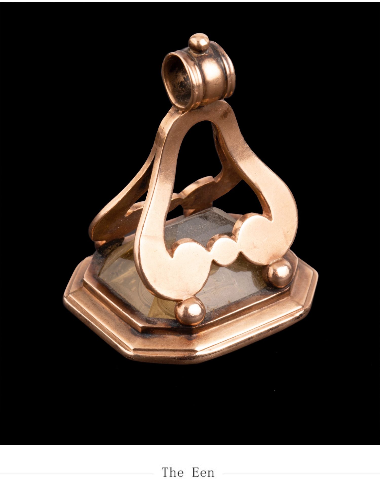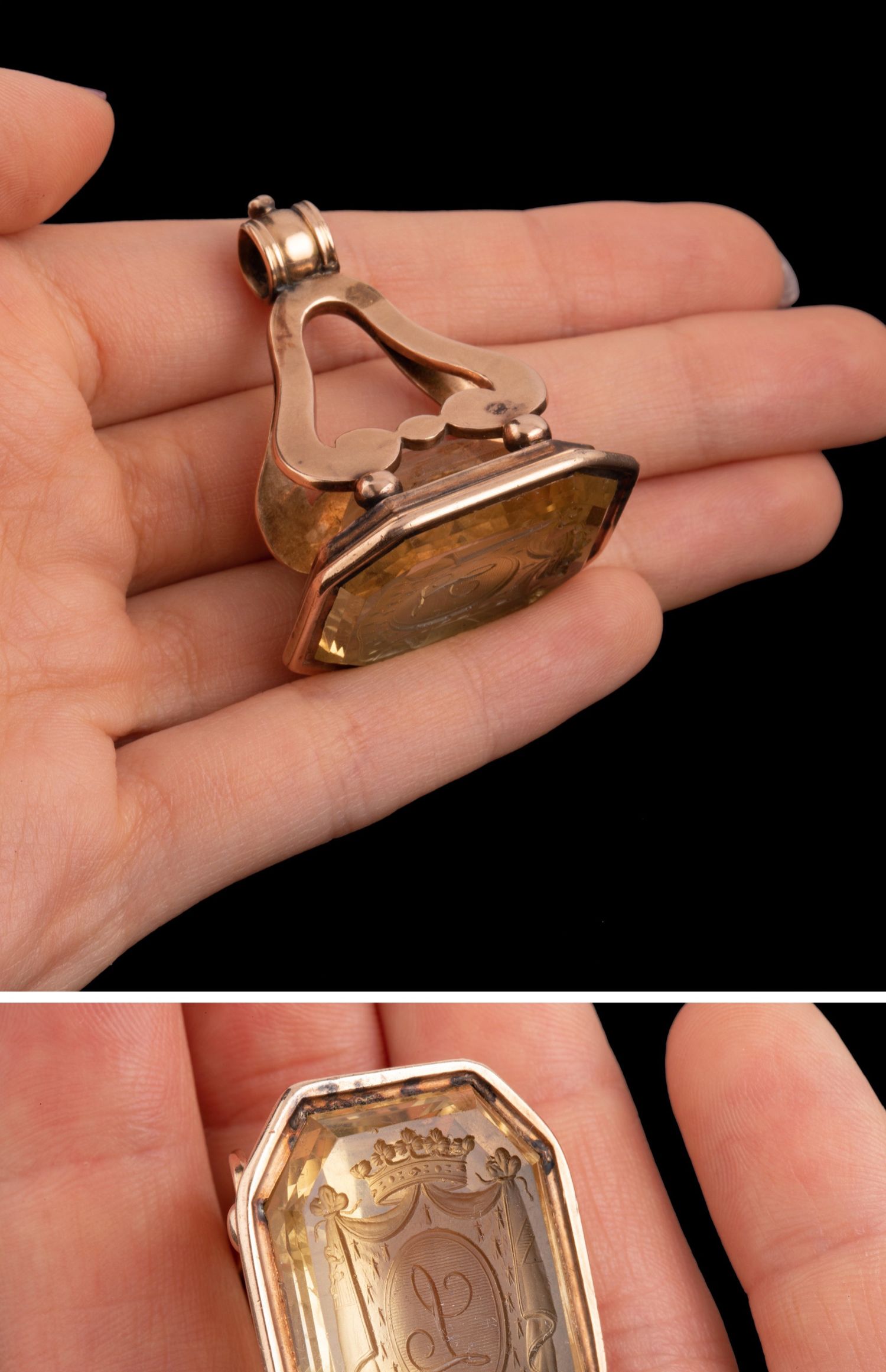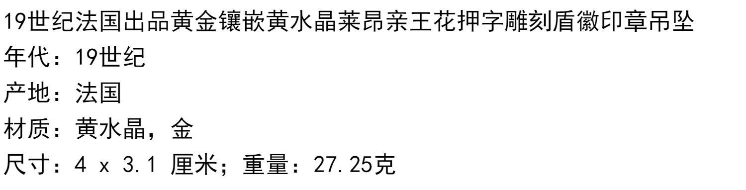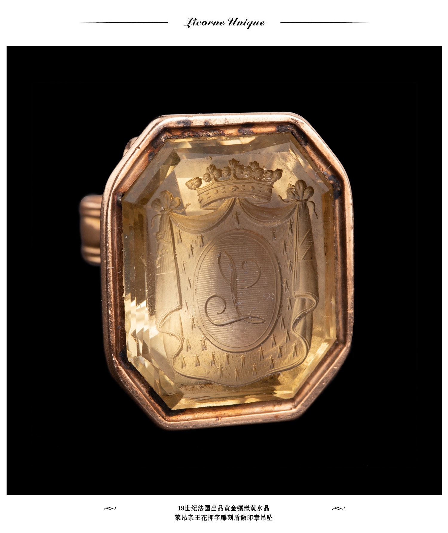 独角鹿西洋古董法国黄金镶嵌黄水晶亲王花押字雕刻盾徽印章吊坠