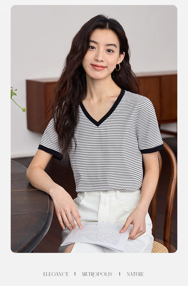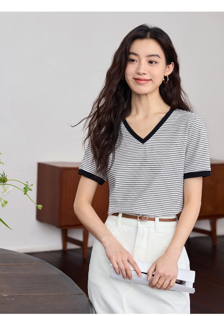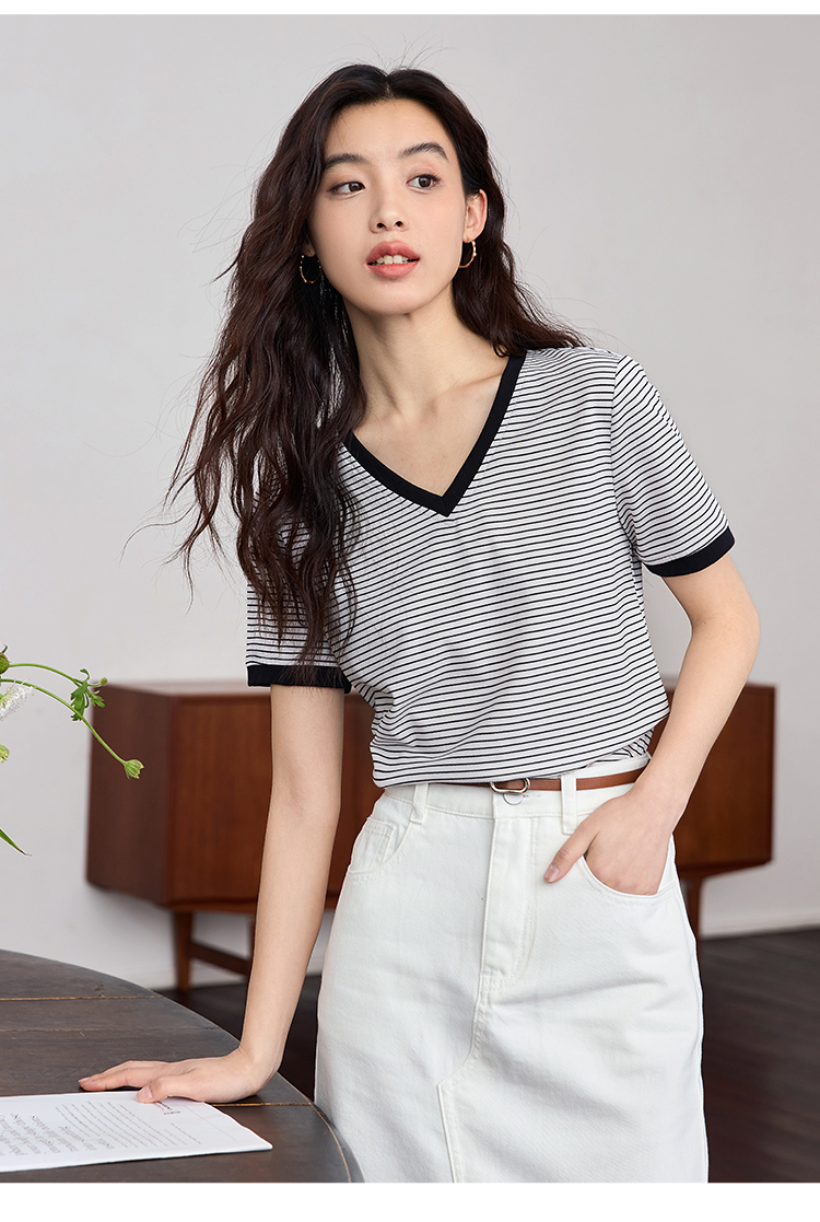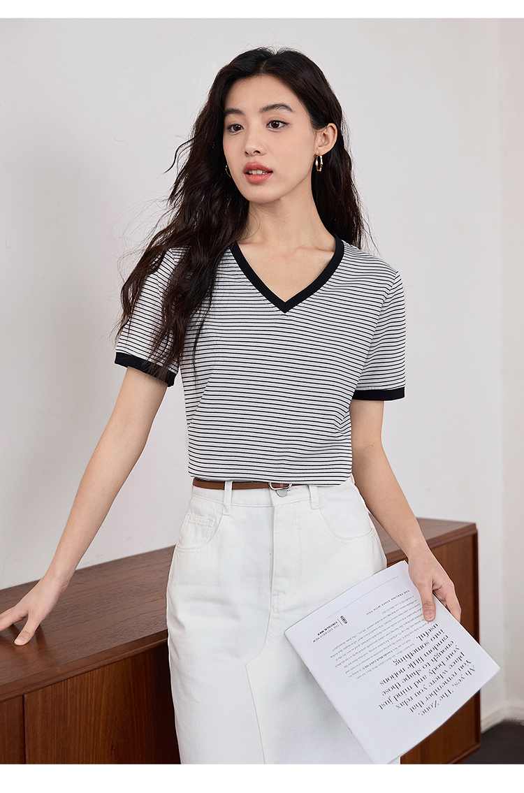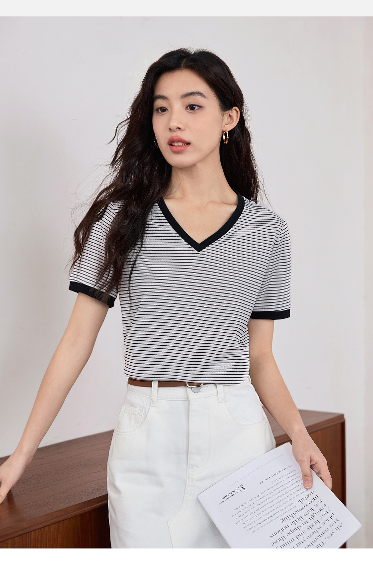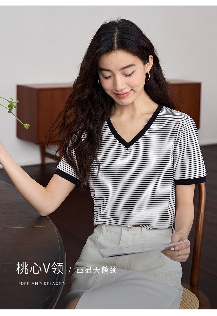 【专属特价】熙世界黑白条纹V领正肩T恤2025年夏季新款简约百搭复古短袖上衣
