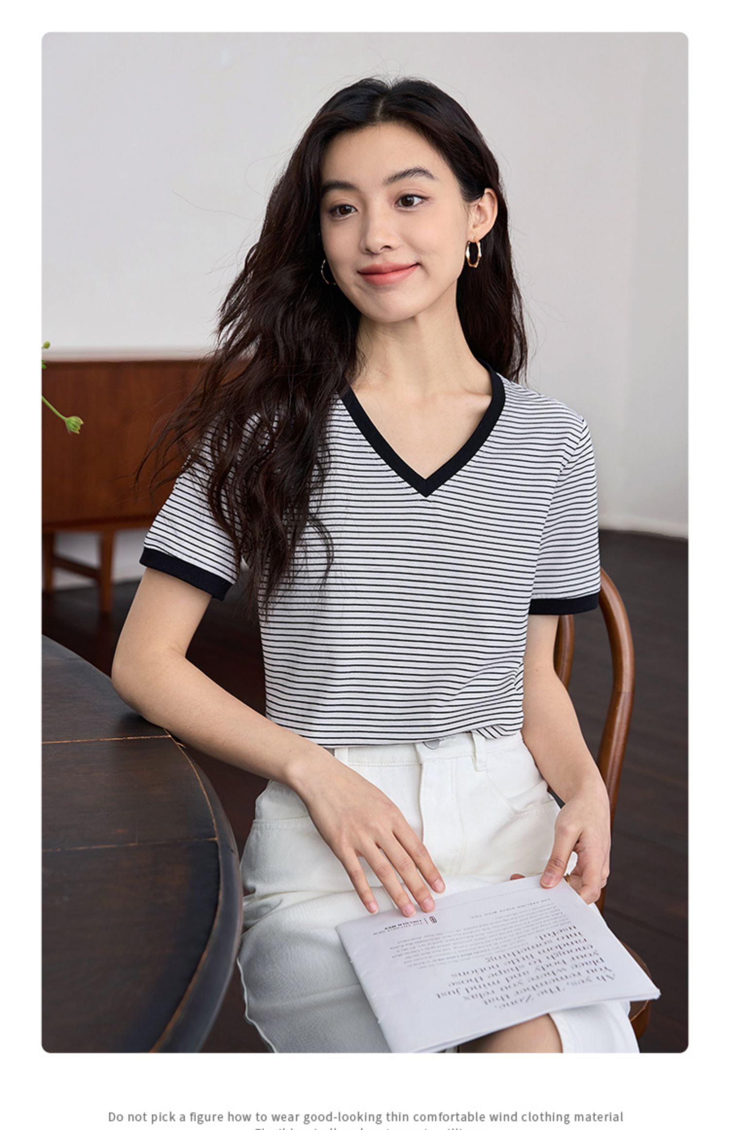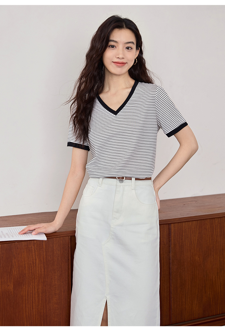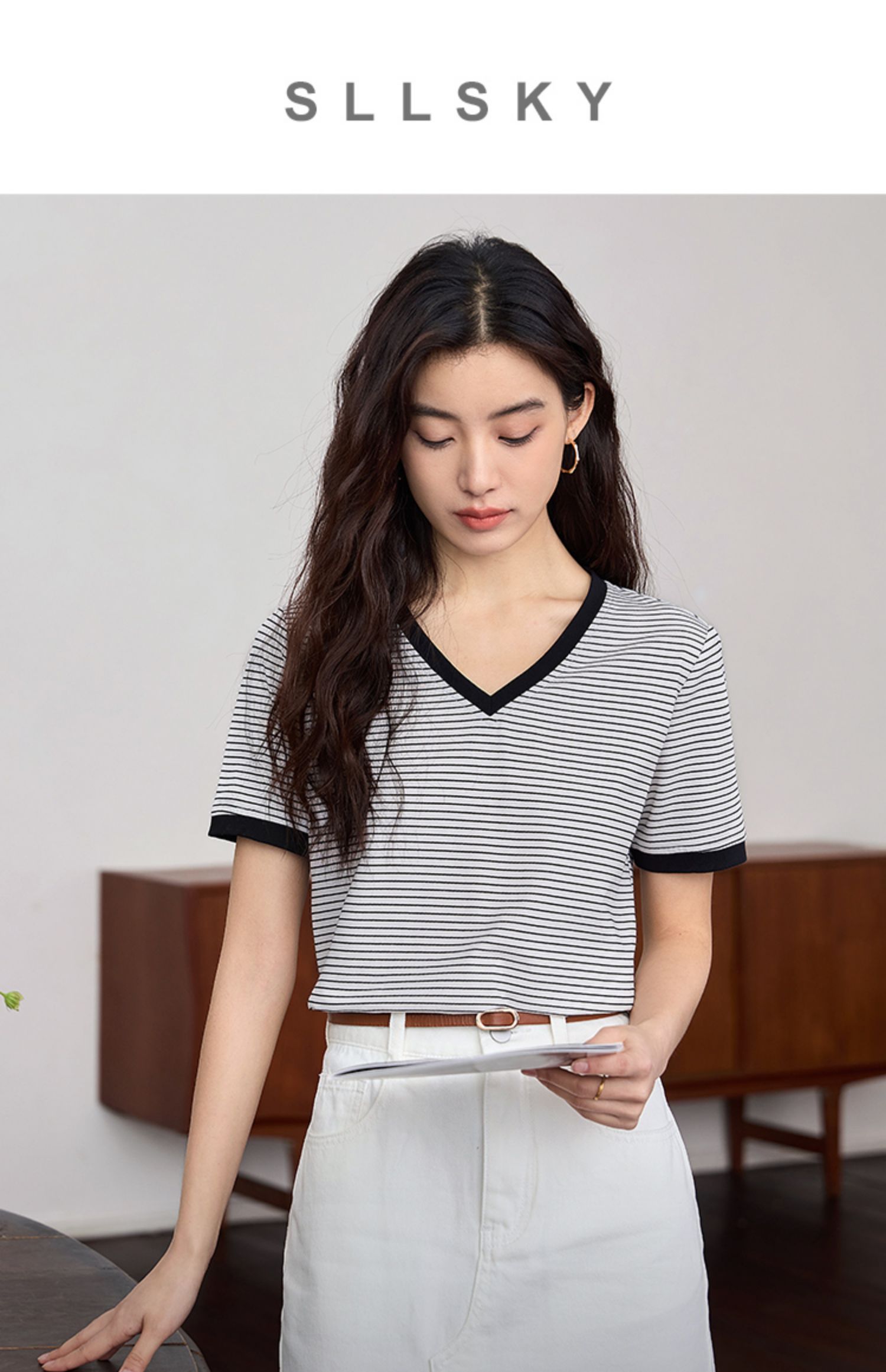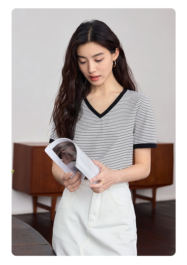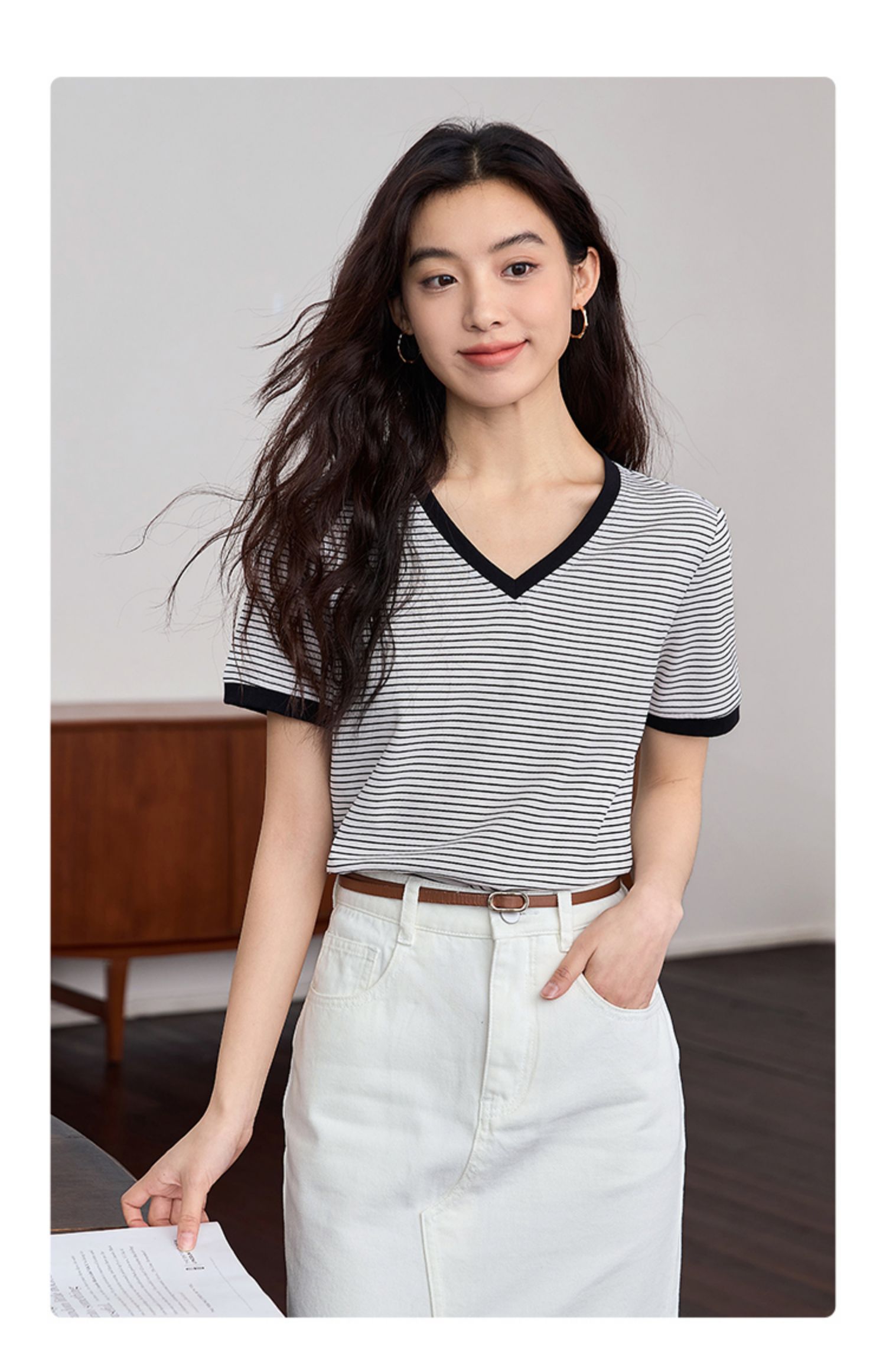 【专属特价】熙世界黑白条纹V领正肩T恤2025年夏季新款简约百搭复古短袖上衣