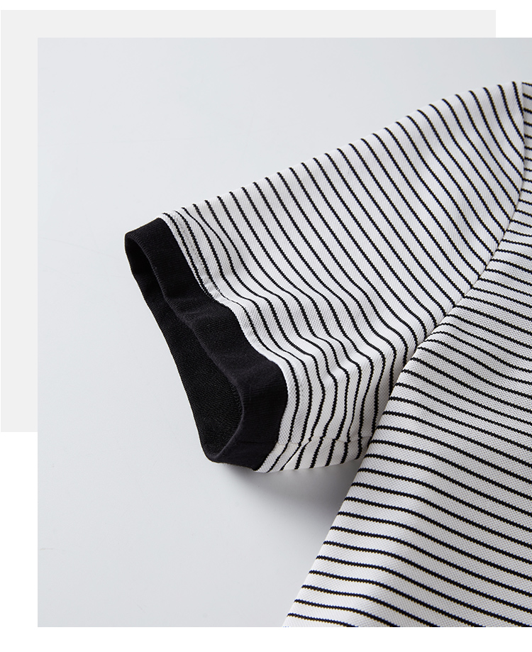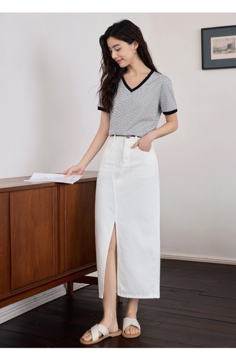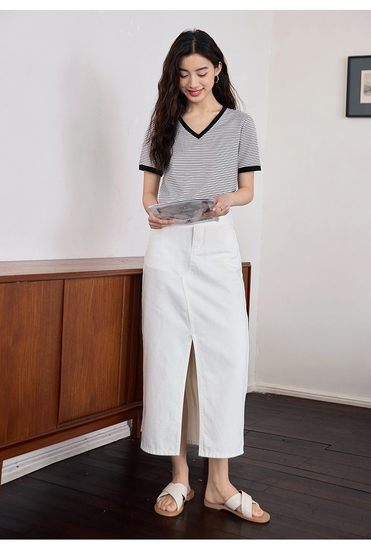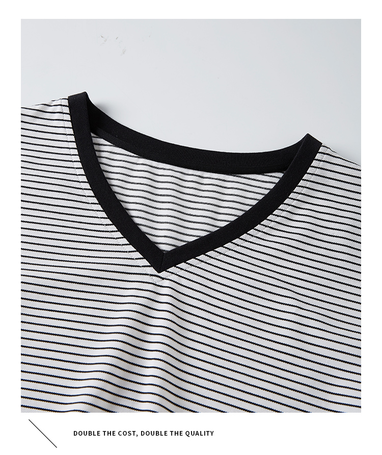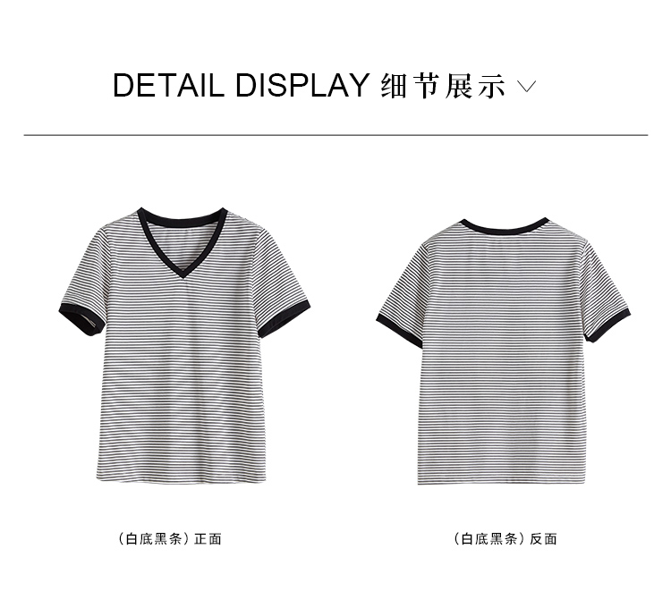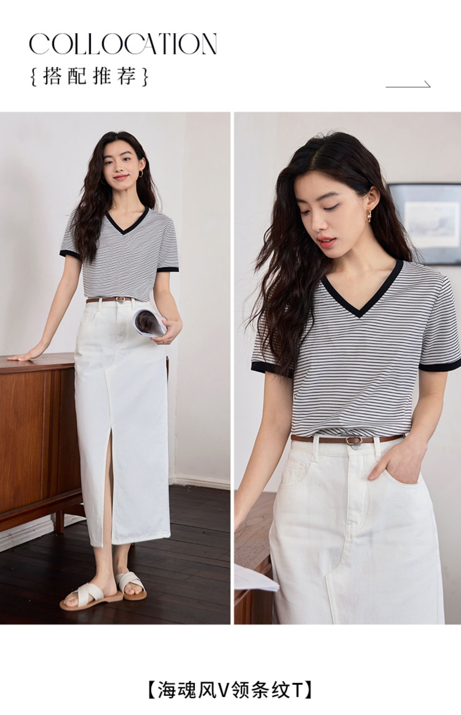 【专属特价】熙世界黑白条纹V领正肩T恤2025年夏季新款简约百搭复古短袖上衣