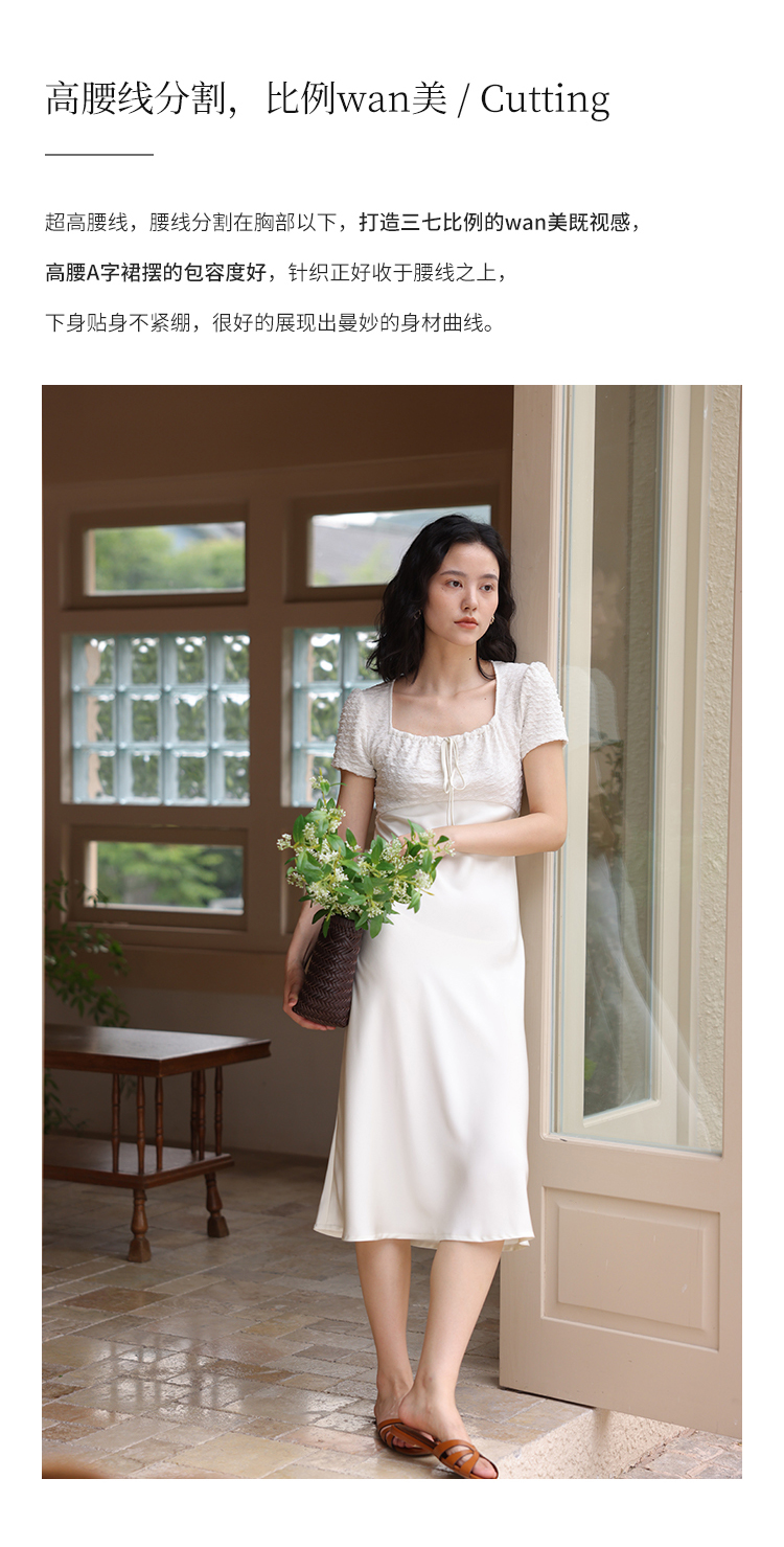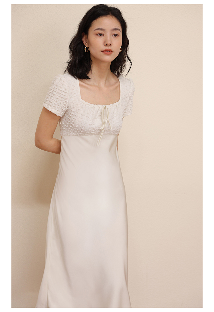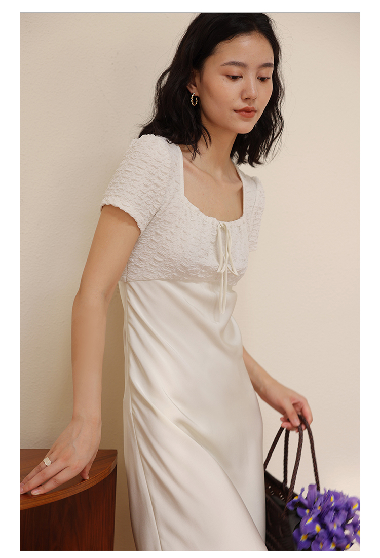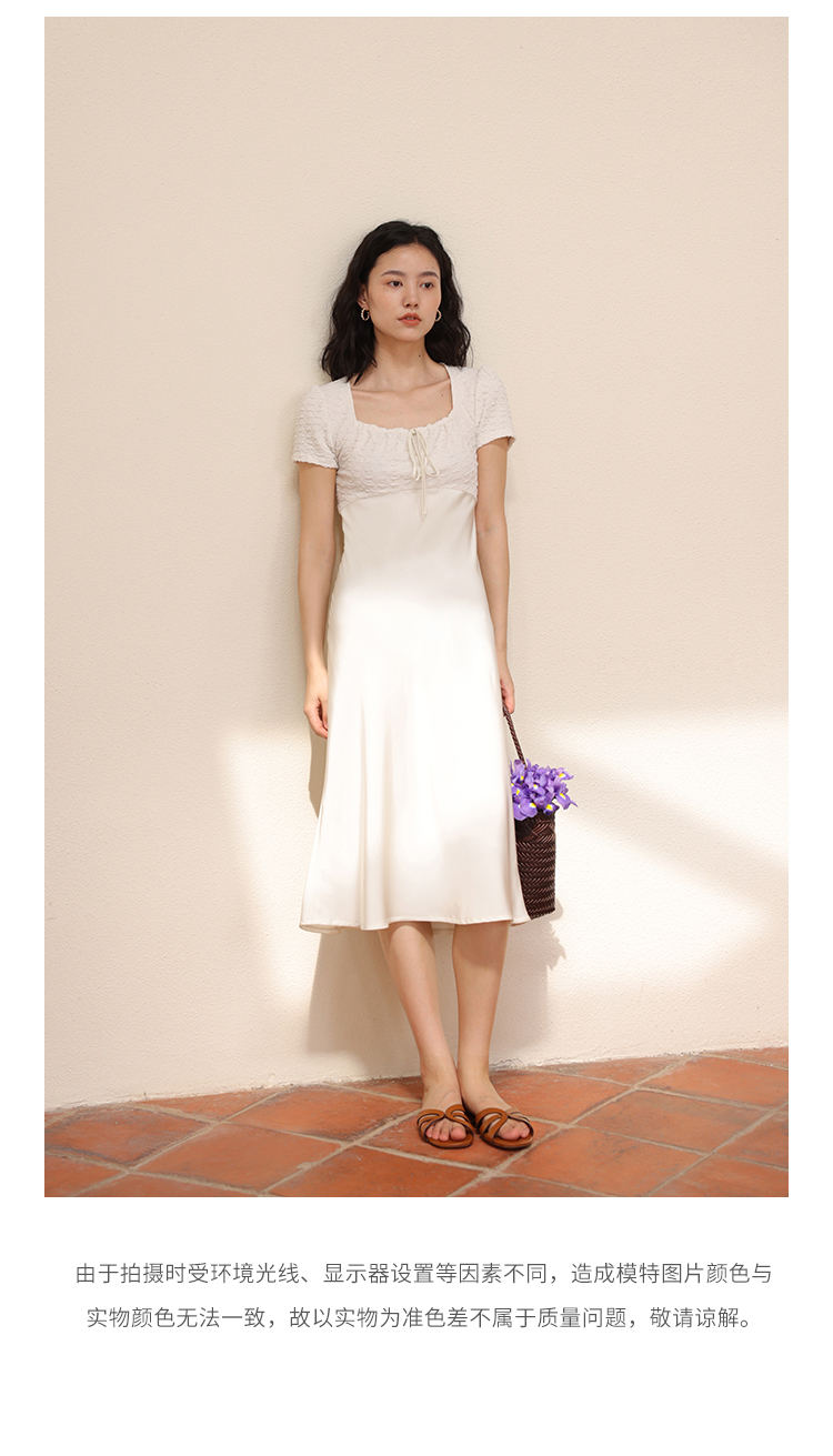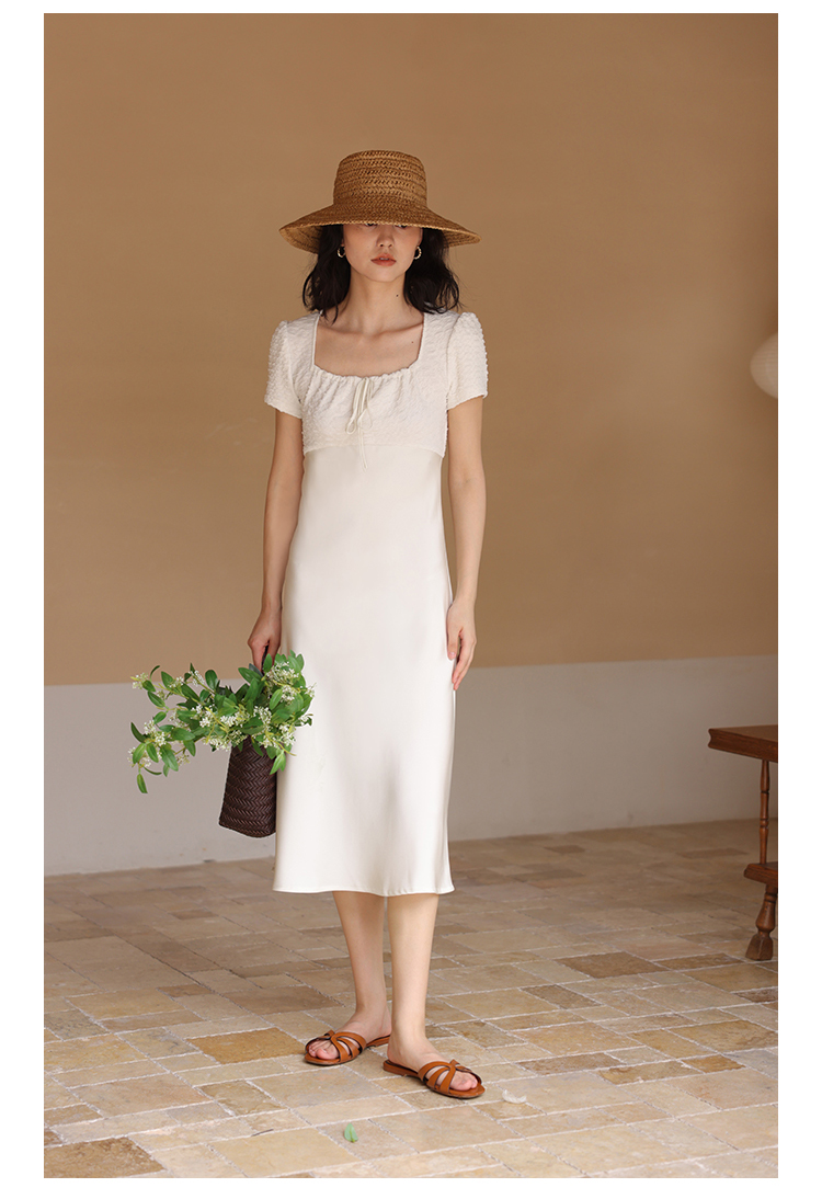 HeyDress方领连衣裙女夏季拼接设计感缎面白色气质小众裙子
