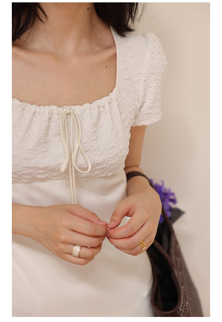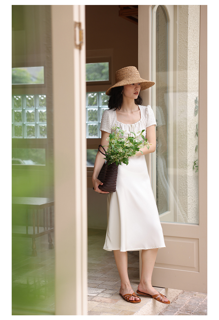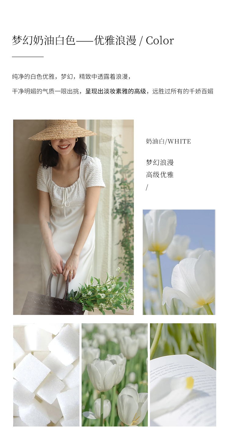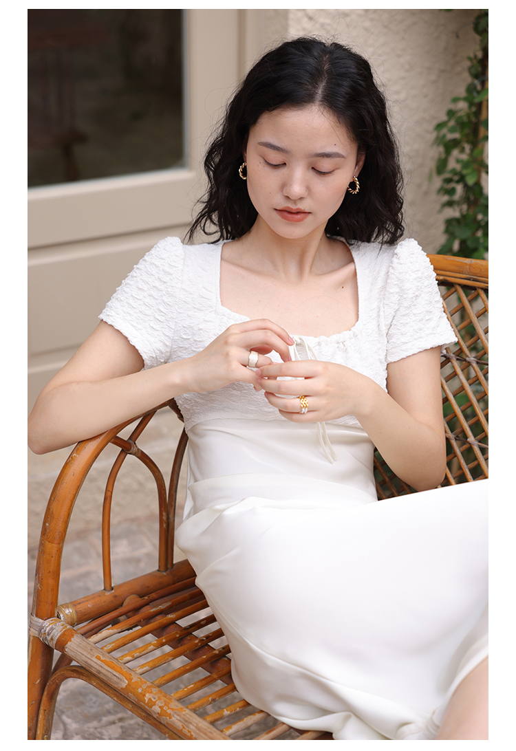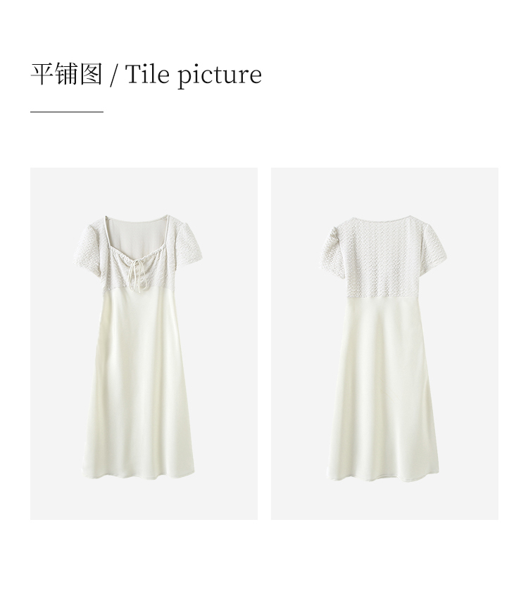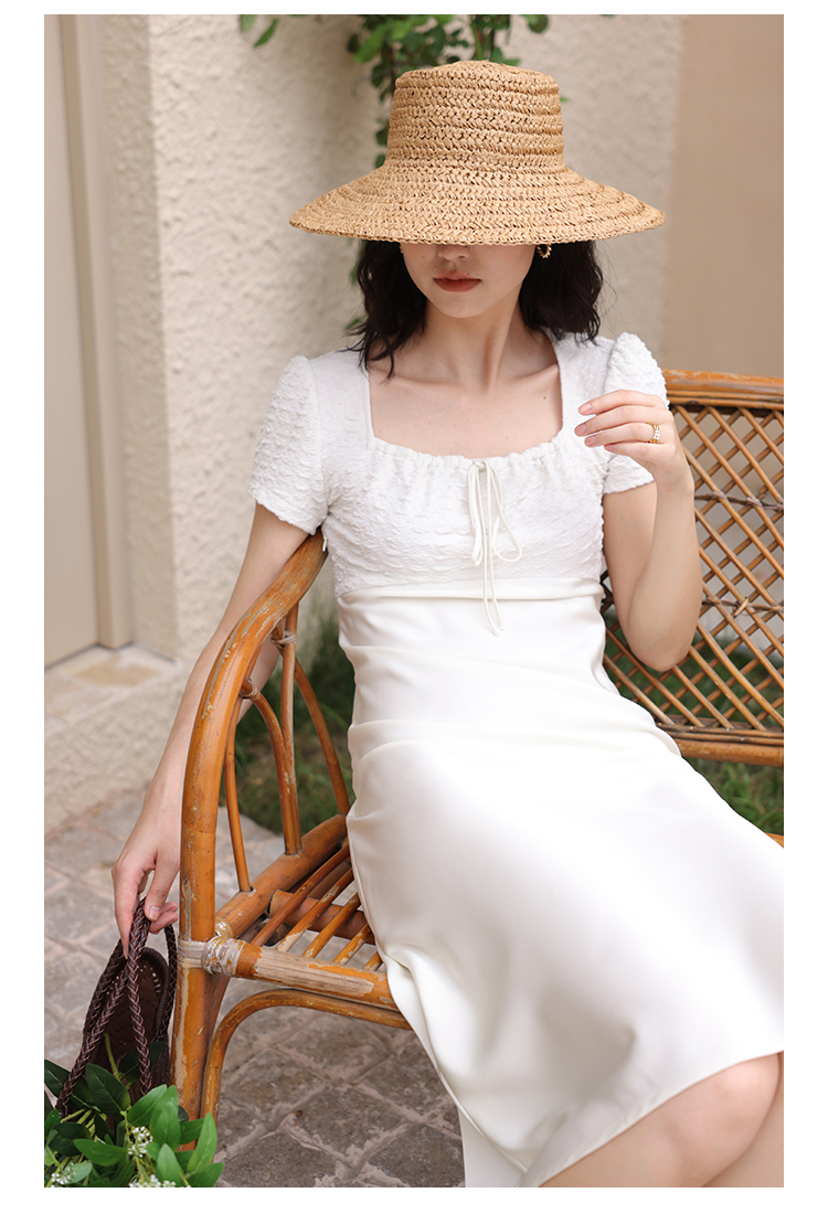 HeyDress方领连衣裙女夏季拼接设计感缎面白色气质小众裙子
