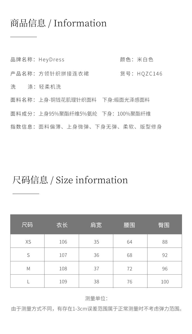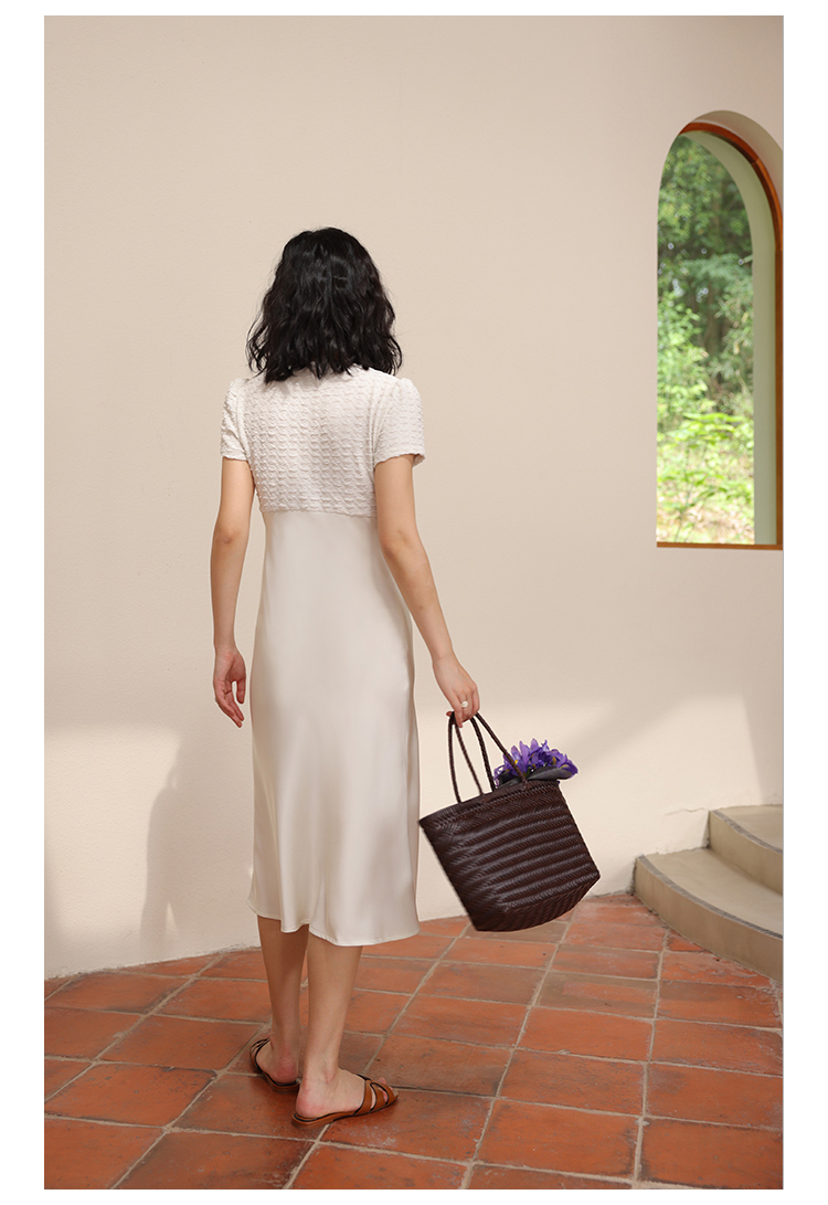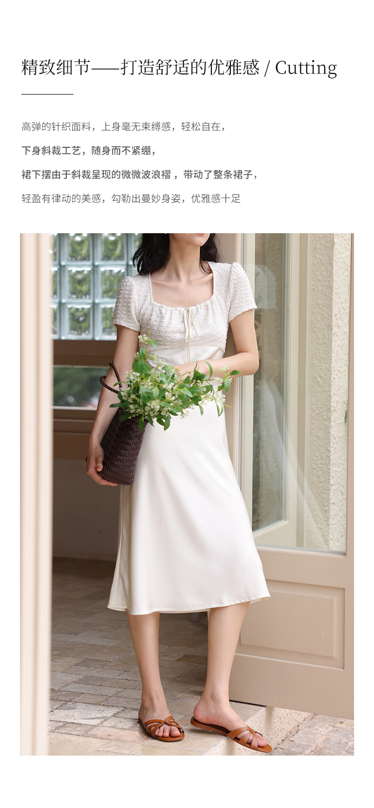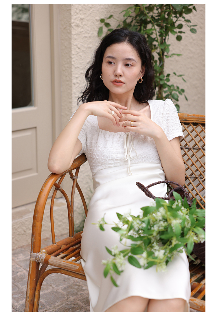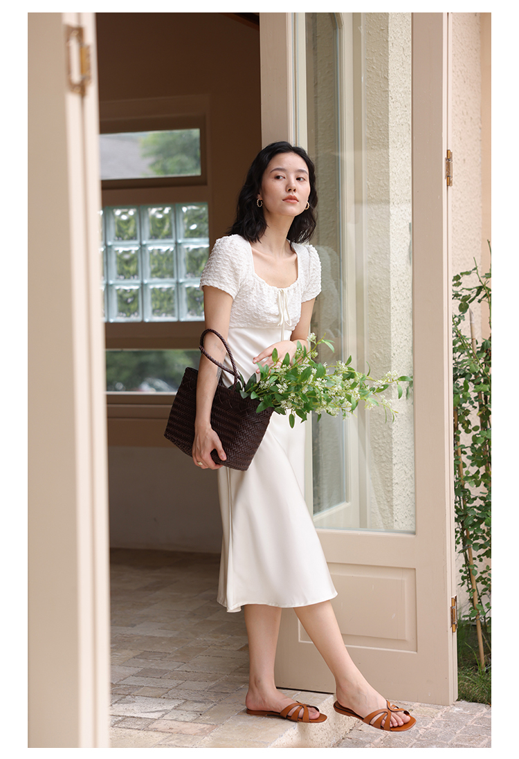 HeyDress方领连衣裙女夏季拼接设计感缎面白色气质小众裙子