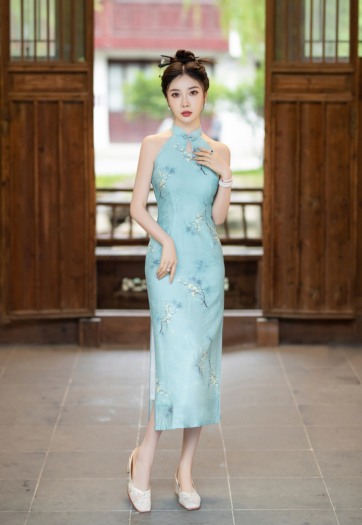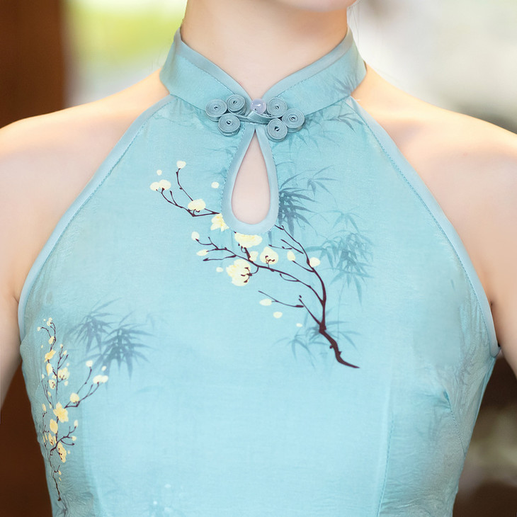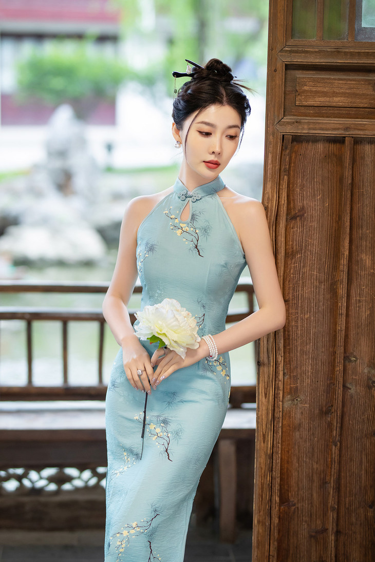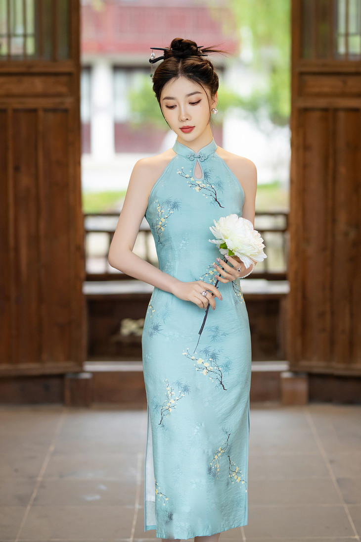 挂脖旗袍改良露肩,双层天丝麻日常写真性感旗袍ZA2003