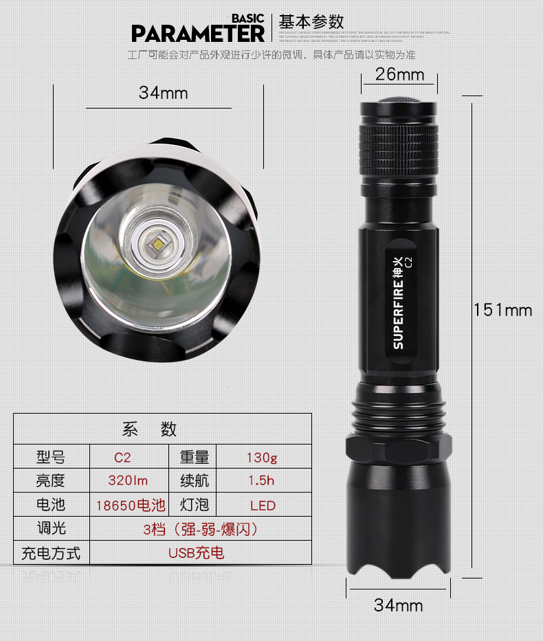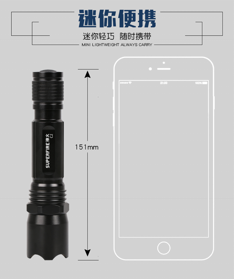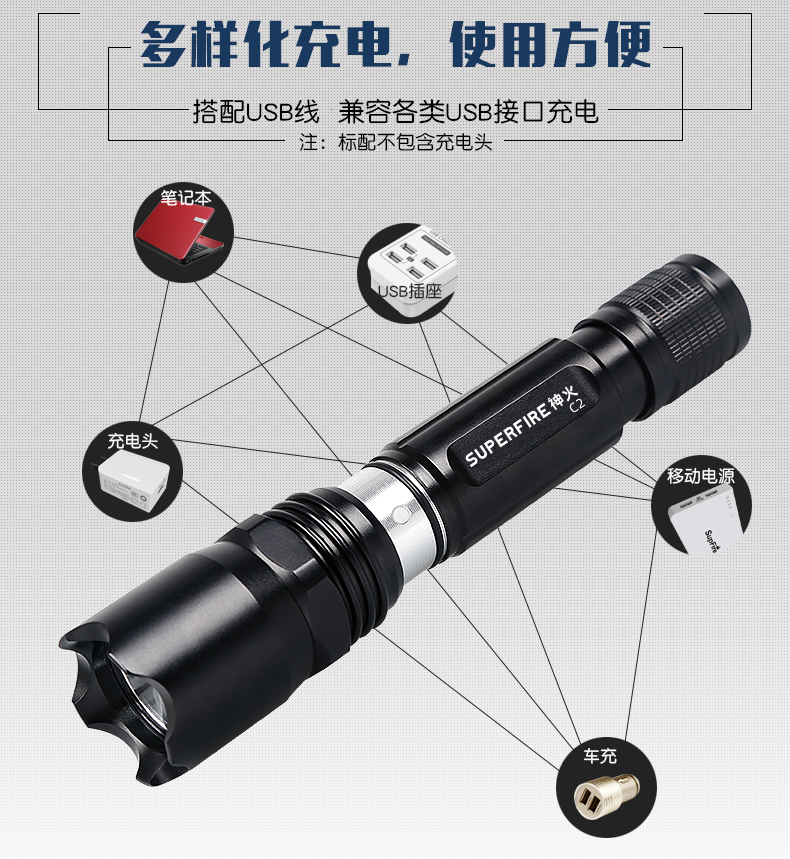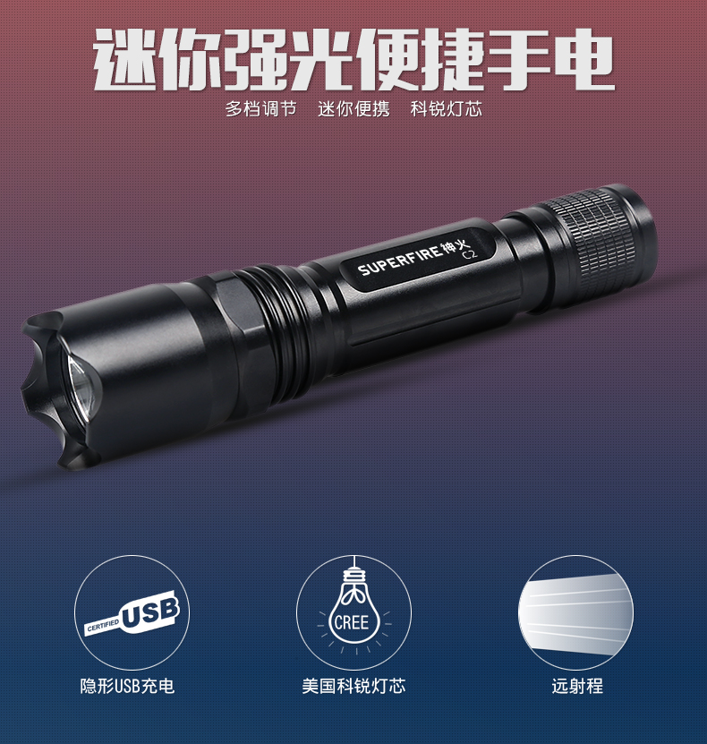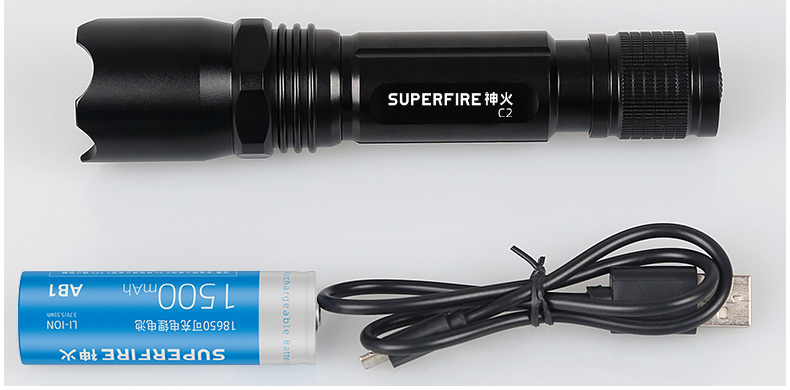 SUPERFIRE神火C2手电筒强光远射家用LED防水可充电迷你超亮小手电