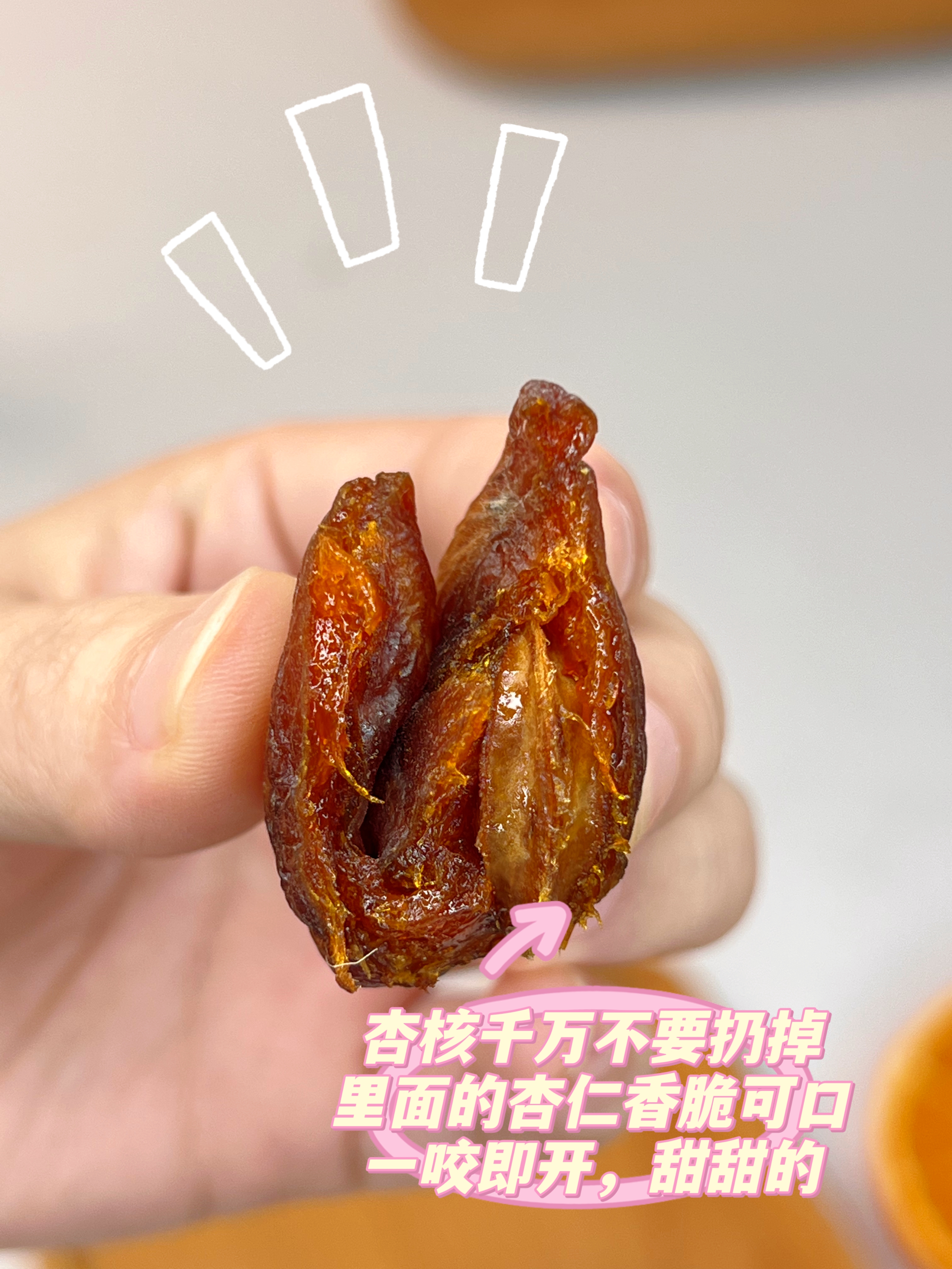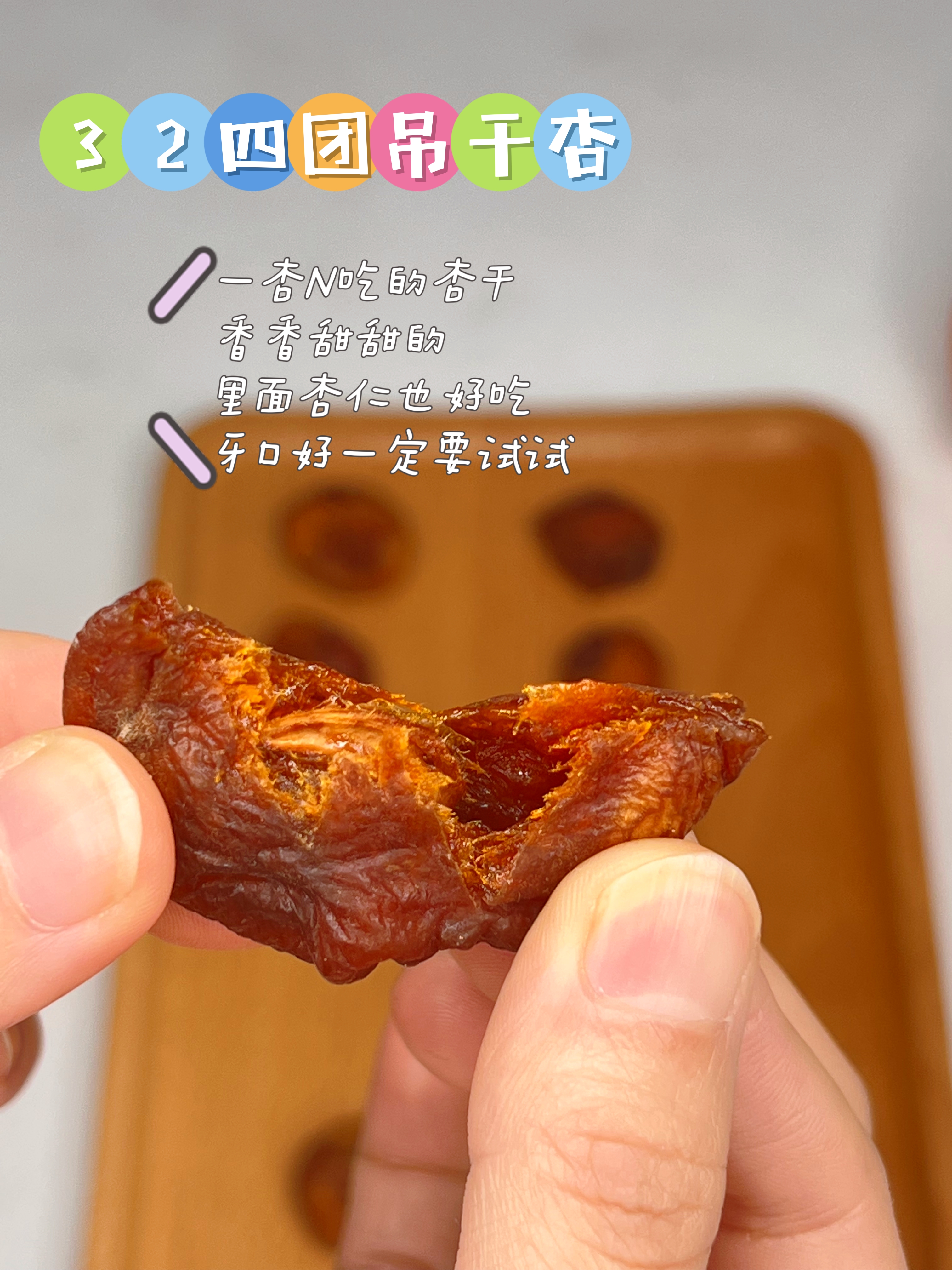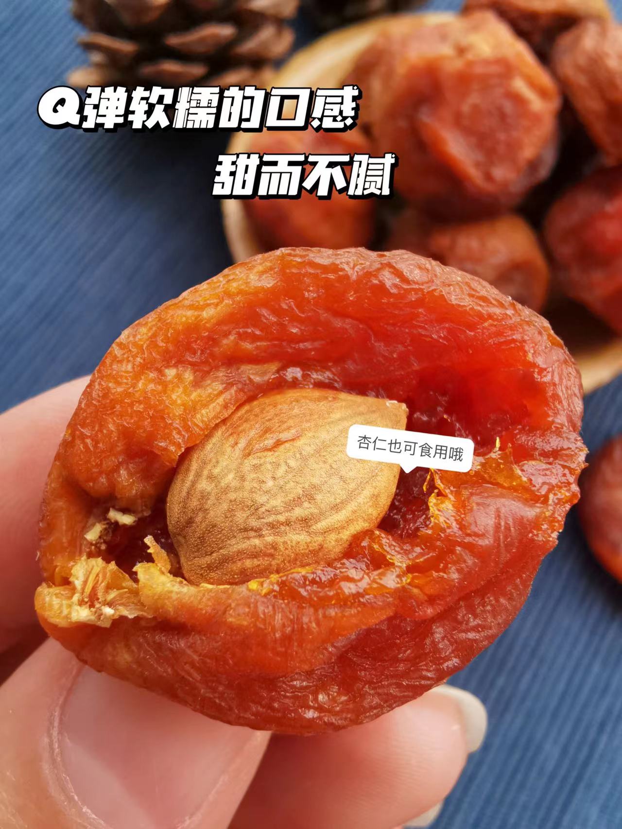 吊干的杏干相比鲜果,甜感更加纯粹和浓郁,同时还保留了水果的软糯感,里面带着杏仁核的,甜杏仁可以吃的哈!
