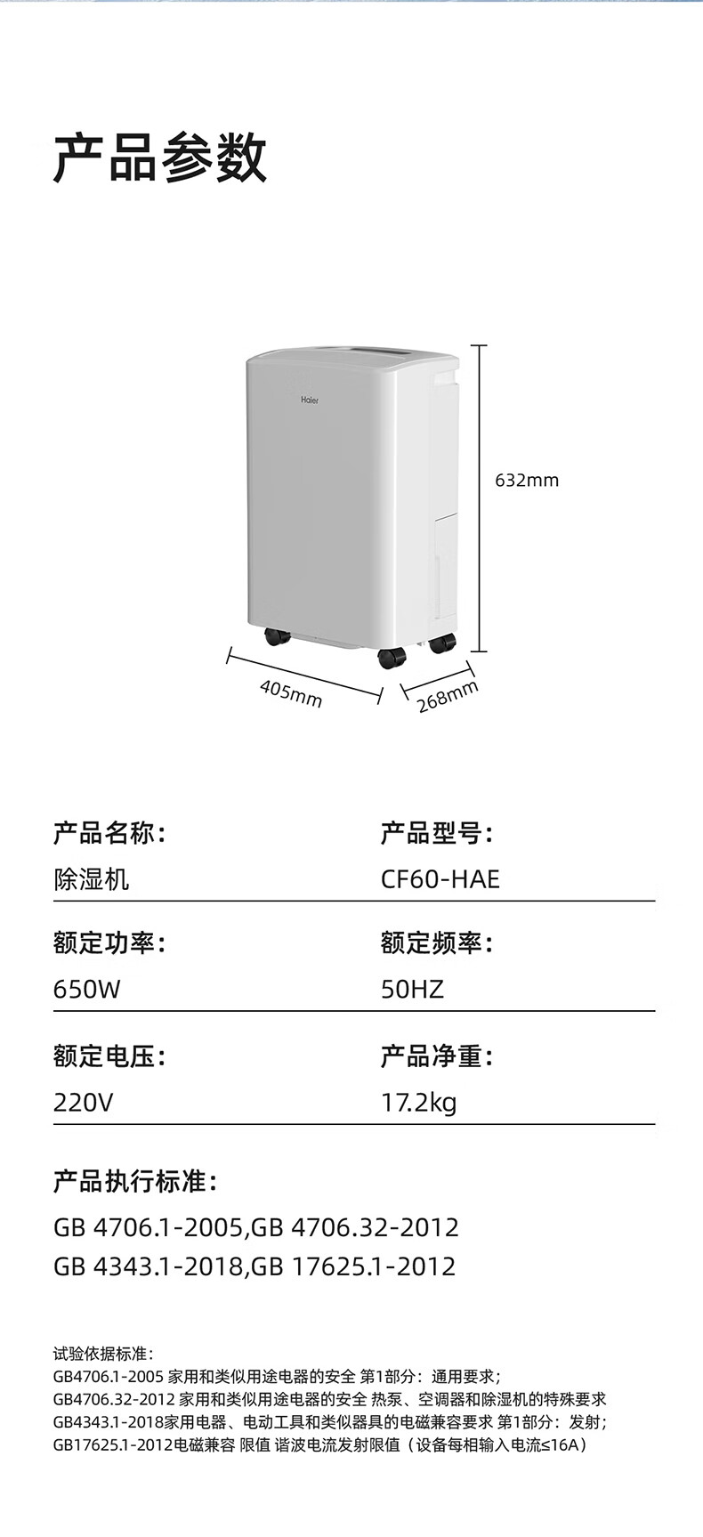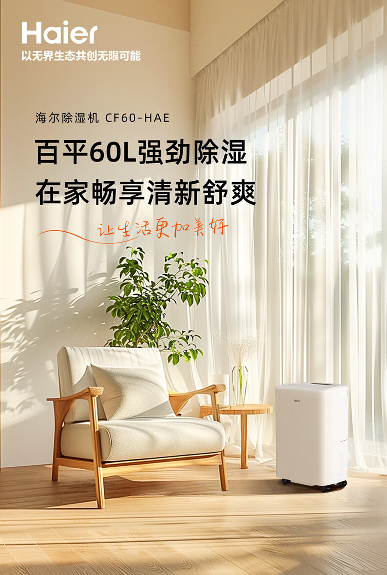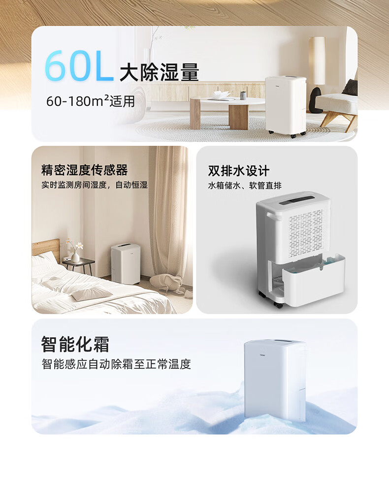 海尔(Haier)除湿机 抽湿机 抽湿器 吸湿器家用轻音防霉防潮地下室档案室干燥机 干衣机 60L/天 120-180㎡ CF60-HAE