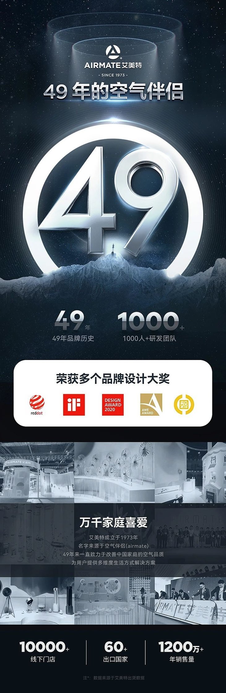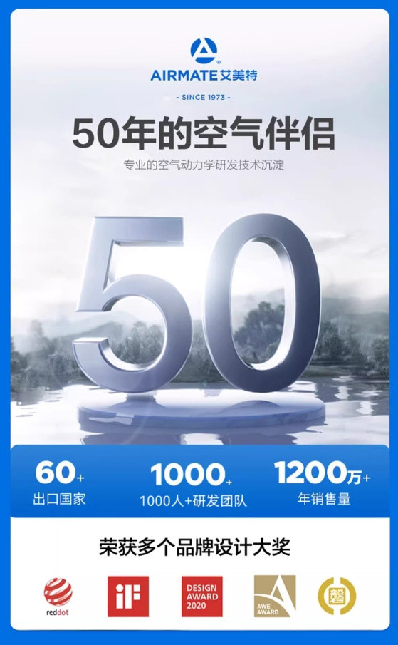 🔺品牌介绍: 艾美特,1973年始创于中国台湾,2013年挂牌上市,49年大品牌,涵盖空气循环扇、电暖器、足浴盆等生活、个护健康、厨房电器,产品进驻国内31个省市的12,000余家商场;线上覆盖天猫、京东、唯品会、苏宁易购等各大电商平台;产品远销出口至日本、韩国、欧洲及美洲等世界60余国家和地区(每3台出口日本的风扇中,有2台来自艾美特)。年出货额30亿,年出货量1000万台。行业驰名品牌,TOP精品轻奢家电品牌。 艾美特做的是与风有关的产品 “风,自海而来”带来轻曼和轻盈 让人身心熨帖 情绪价值很难量化和具化