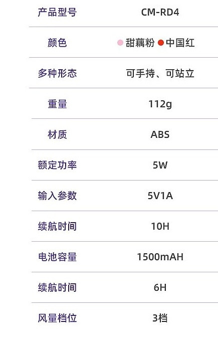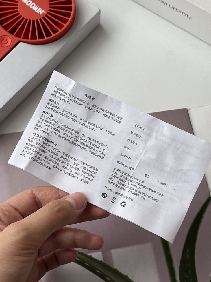 艾美特迷你手持小风扇 【产品规格】1个 【颜色】: CM-RD4-1(中国红) CM-RD4-2(甜藕粉) AH01(珊瑚红) 【材质】:机身ABS 【档位】:三档风速调节 【电池】: AH01:2000mAh/续航6小时 CM-RD4:1500mAh/续航6小时 【功率】 CM-RD4:5W AH01:4W 【产品尺寸】 CM-RD4:166.5*79*28.7mm AH01:1186*90*41mm 【产地】中山 【生产日期】2025年最新 【保质/质保期】质保一个月(清仓原因只换不修) 【发货地点】佛山仓 【发货物流】圆通/中通/韵达,随机发 【发货时效】3-5天(节假日顺延) 【不发货地区】西藏/新疆 【加运费地区】青海/宁夏/甘肃/内蒙古,加10元可发 【售后标准】 1、支持7天无理由退换货(无理由/拦截/拒收/改地址,需扣除寄出运费4元,同时顾客退回时满足包装完好,配件齐全,不影响二次销售,同时退回运费由顾客自动承担) 2、30天内质量问题退换货产生的邮费报销,需要提供邮费寄出凭证,否则不予报销(提供凭证后,品牌方进行上限报销(最高报销8元),同时退回快递需选择普通快递,如顾客退回寄了顺丰等高昂快递,品牌方则按普通快递进行报销) 3、退换货需使用普通快递(圆通/中通/韵达等)寄回,不接受任何到付件,发了顺丰/EMS均按普通快递