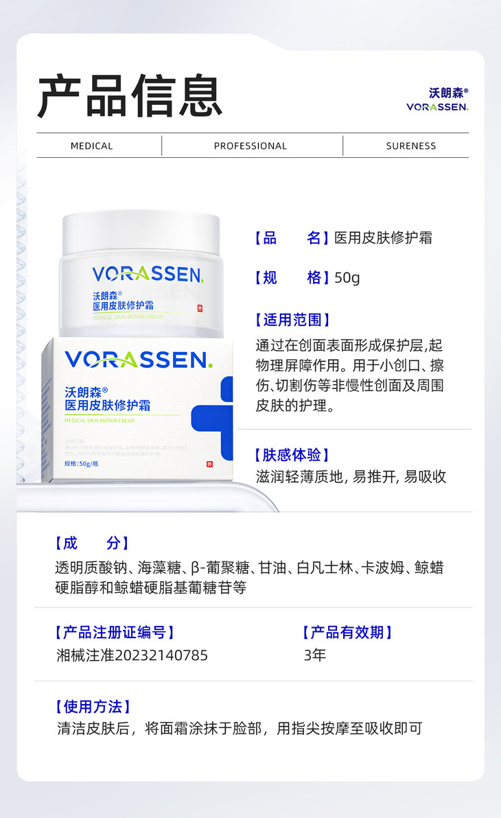 🌟【械字号认证,专业守护】 沃朗森可不是普通面霜 湘械注准+双重专利加持 官方认证,医用级修护标准,医院皮肤科同款安心感💯 无菌生产环境,无酒精、无香精、无色素 敏感肌姐妹可闭眼冲!