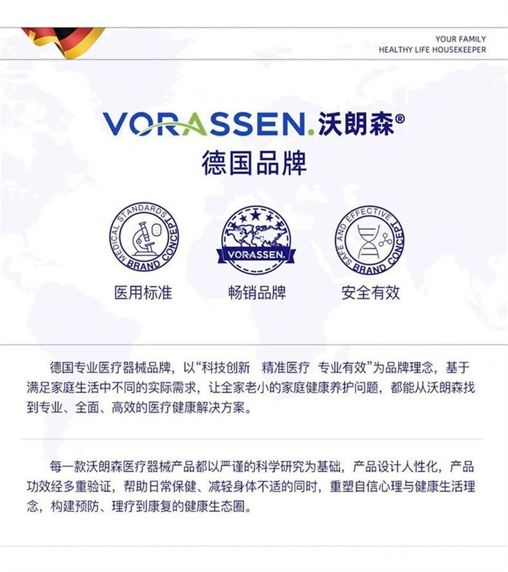 沃朗森是德国专业医疗器械品牌 有 10 项专利技术、百人以上专家团队及 50 多家顶尖原料商合作 以 “科技创新 精准医疗 专业有效” 为理念 基于家庭需求提供解决方案 产品以科学研究为基础,设计人性化 功效经验证,构建健康生态圈