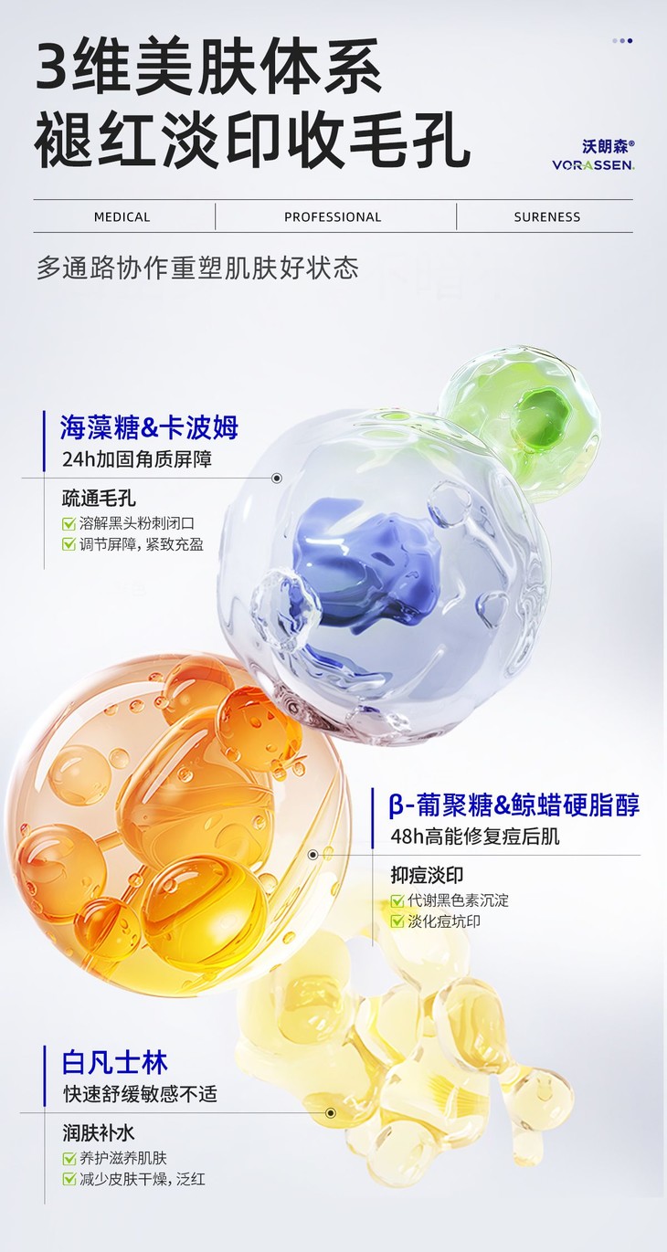 敏肌叠加痘肌的姐妹看过来——是不是总陷在“泛红没消又冒痘印,毛孔还越堵越糙”的循环里? 沃朗森这套「3维美肤体系」直接把这些问题按头解决: 1. **海藻糖+卡波姆**:24小时加固角质屏障,同时疏通毛孔——黑头、闭口悄悄消退,屏障紧致得像“城墙” 2. **β-葡聚糖+鲸蜡硬脂醇**:48小时高能修护痘后肌,代谢黑色素沉淀+淡化痘坑印,泛红后的暗沉感直接褪淡 3. **白凡士林**:快速舒缓敏感不适,同步养肤补水,干痒、泛红等敏感受损问题当场“熄火” 多通路协作精准击破敏肌+痘肌的“脆皮+糙皮”困扰 素颜都能透出稳当当的好状态