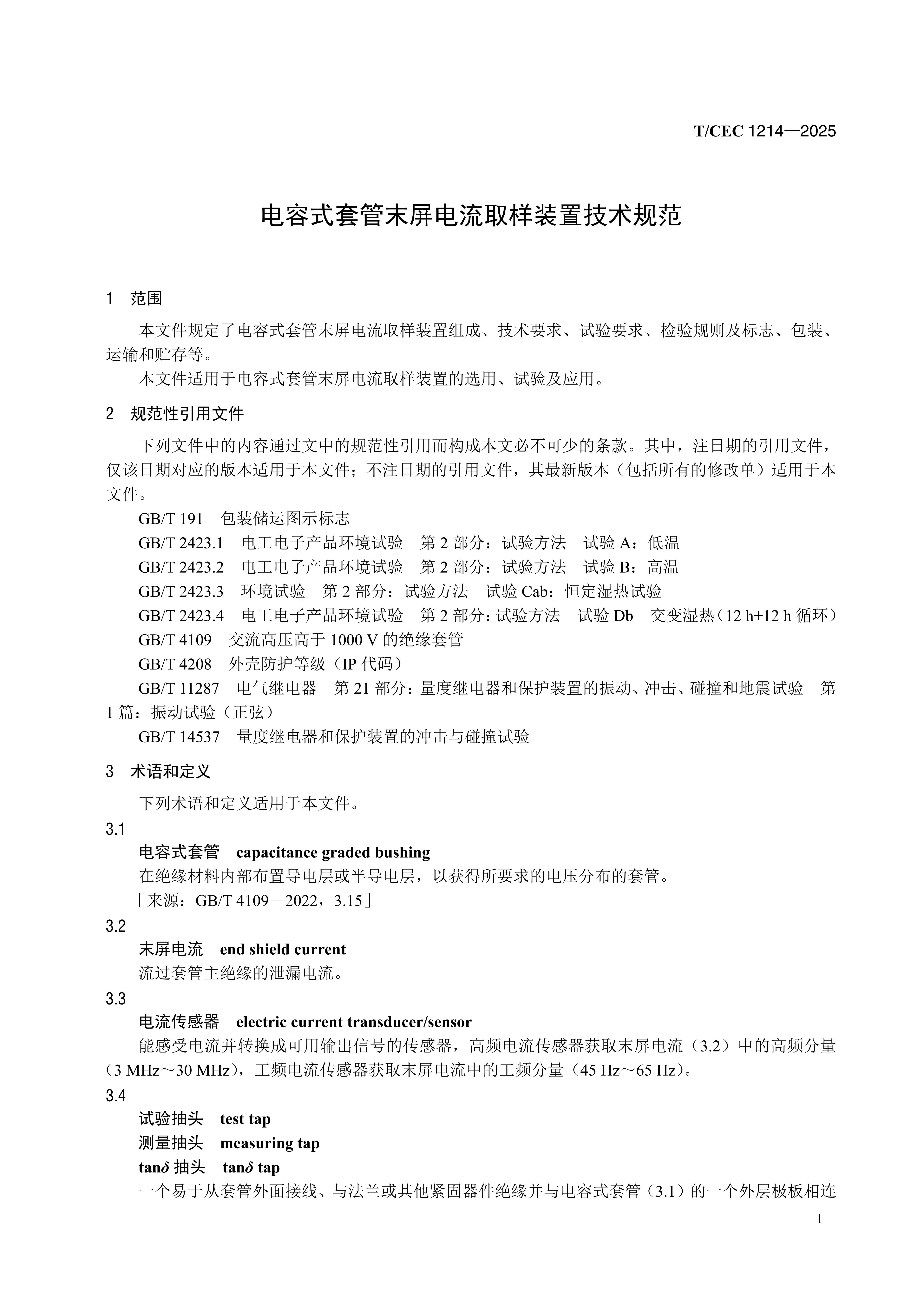 【按需印刷】T/CEC1214-2025 电容式套管末屏电流取样装置技术规范