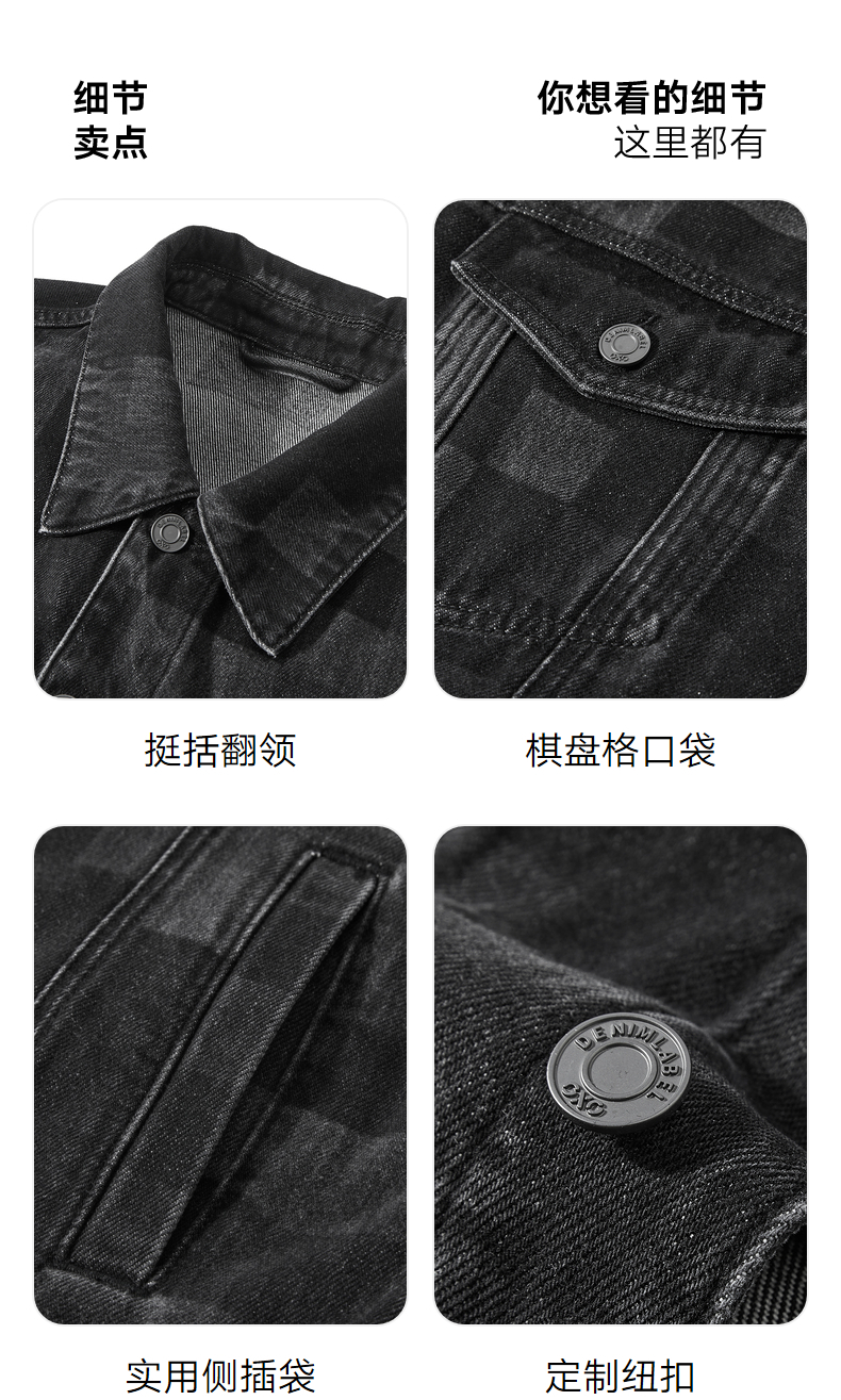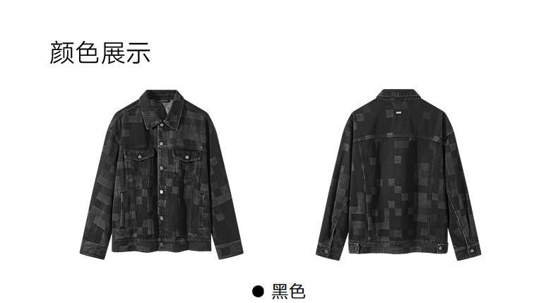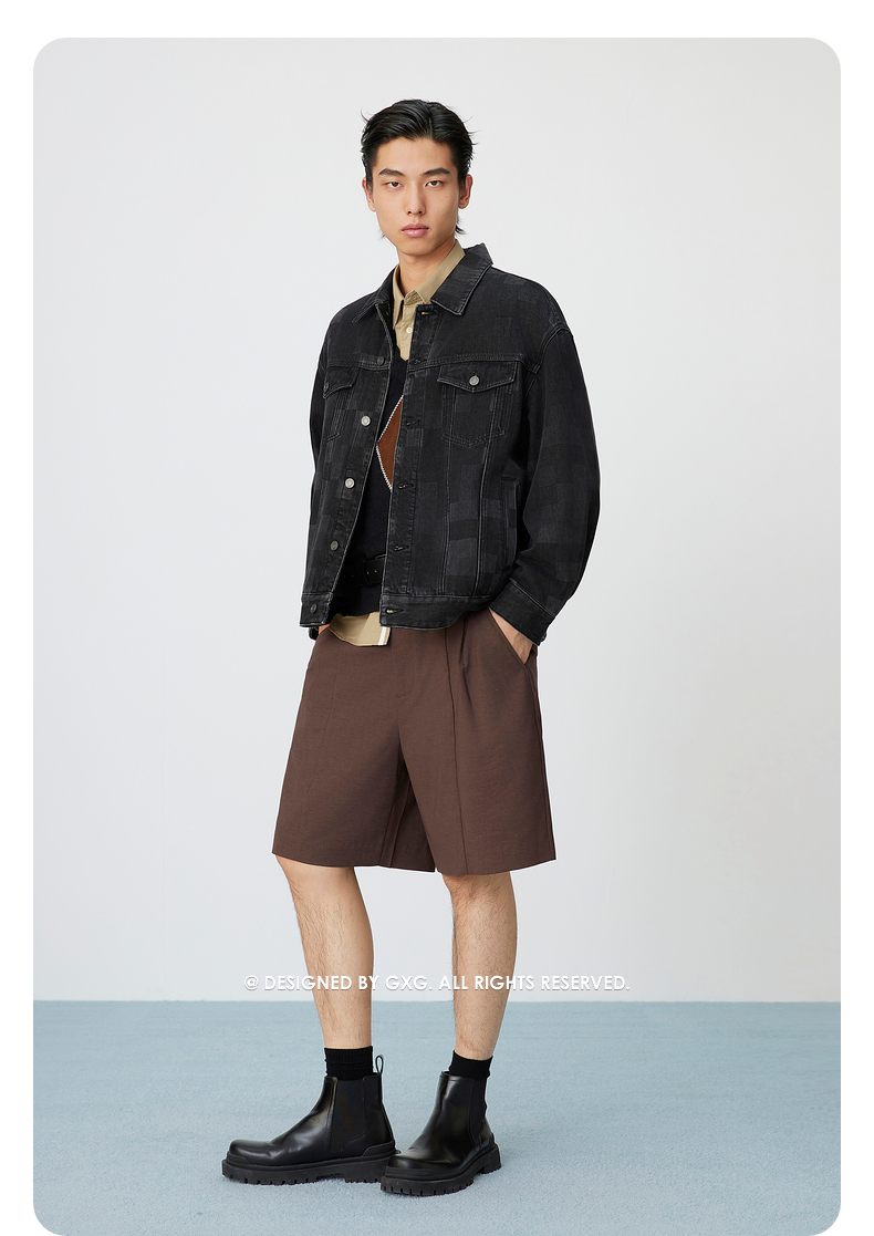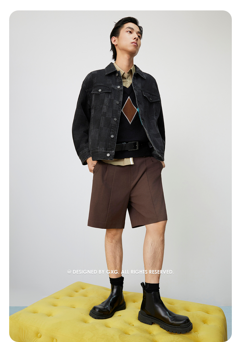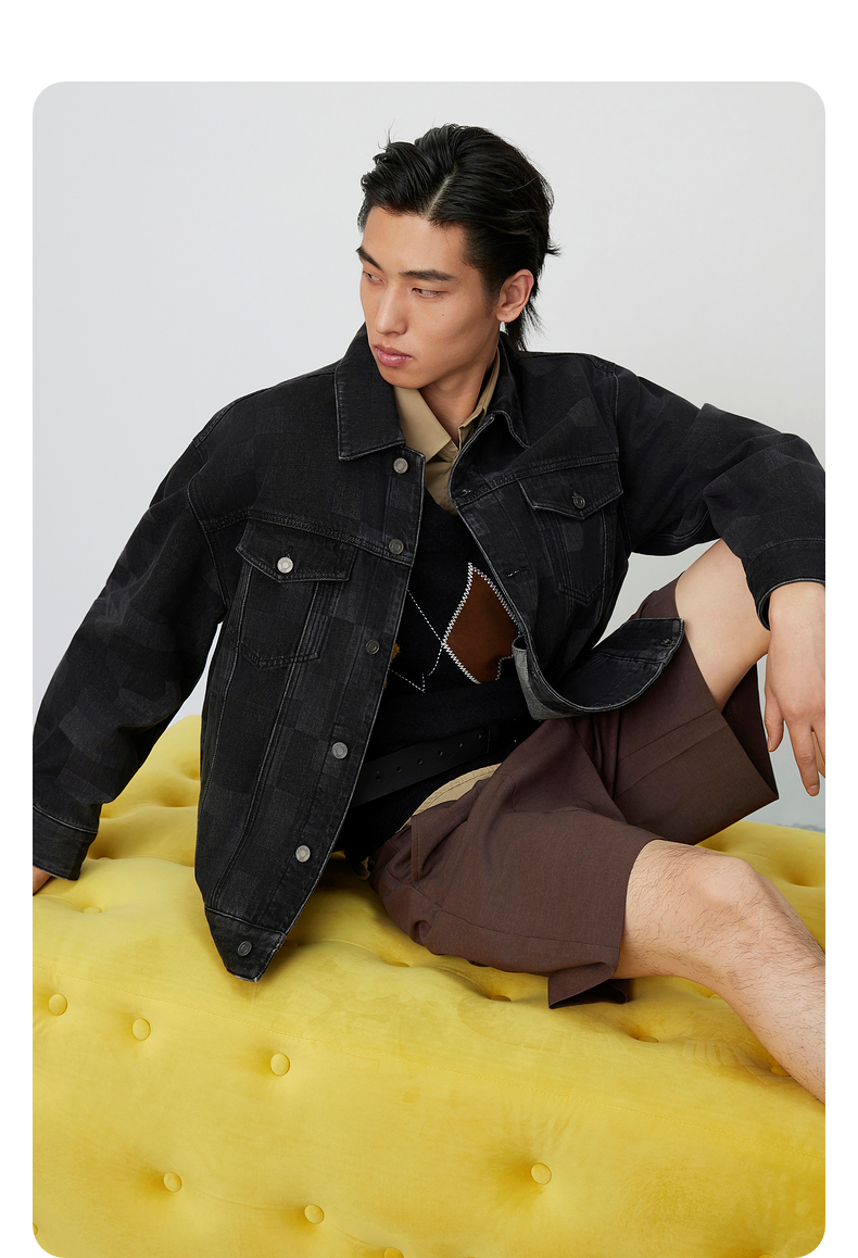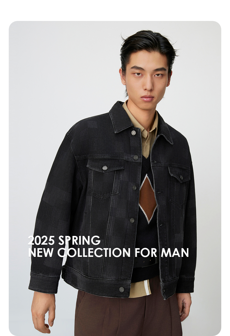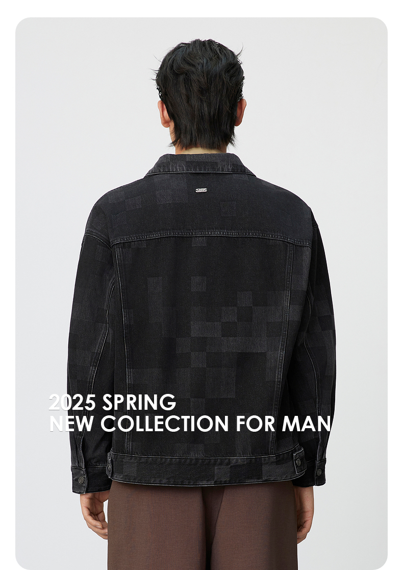 GXG男装 棋盘格镭射工艺斜纹复古翻领牛仔夹克外套 25年春热卖